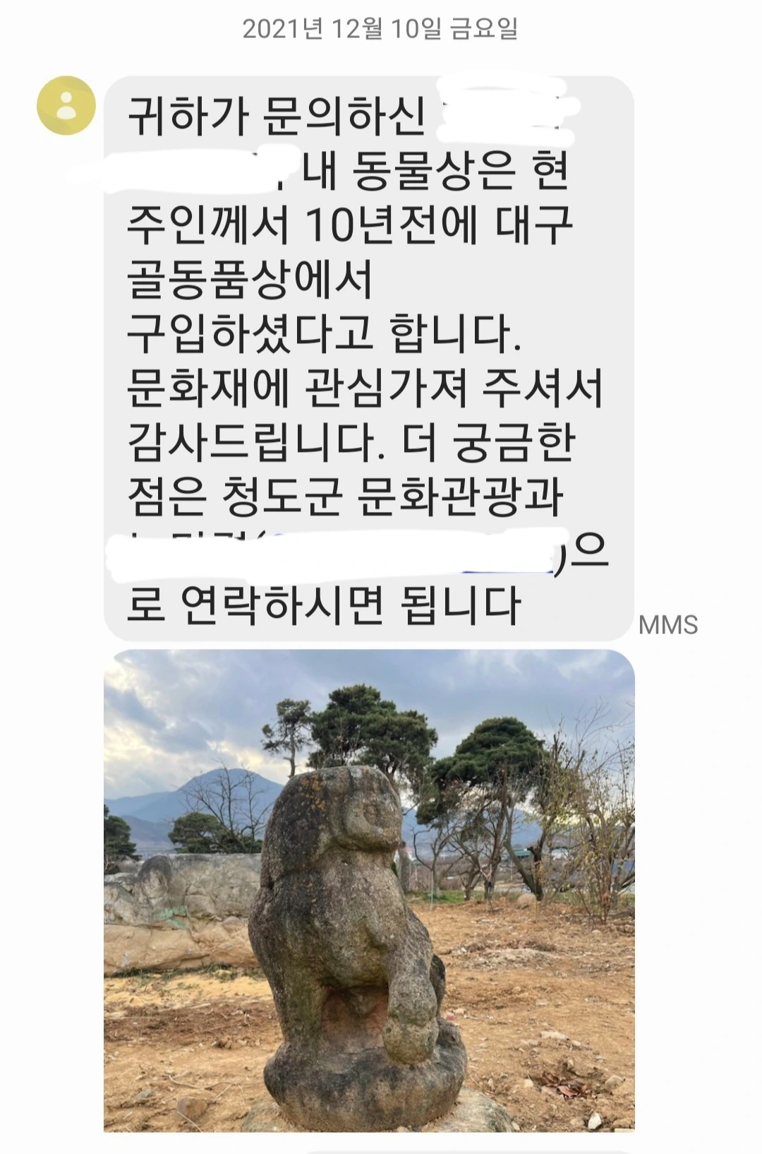 나는 문화재라는 말은 너무 앞서 간 느낌이 들어 유물로 정정했다. 흥분되었지만 짐짓 차분한 척 자초지종을 이야기했다. 그 주무관은 내가 보낸 사진을 확인하고 장소도 물어보고는 확인 후 연락 주겠다고 했다.
