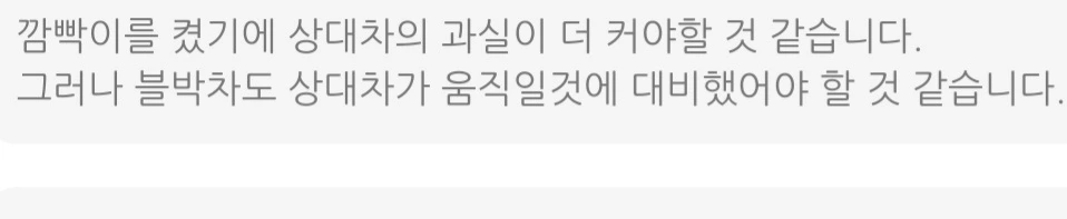 내차가 SUV라 차체가 높고 상대방 차가 붙어 있어서 깜빡이가 보이지 않았던 거였다.
