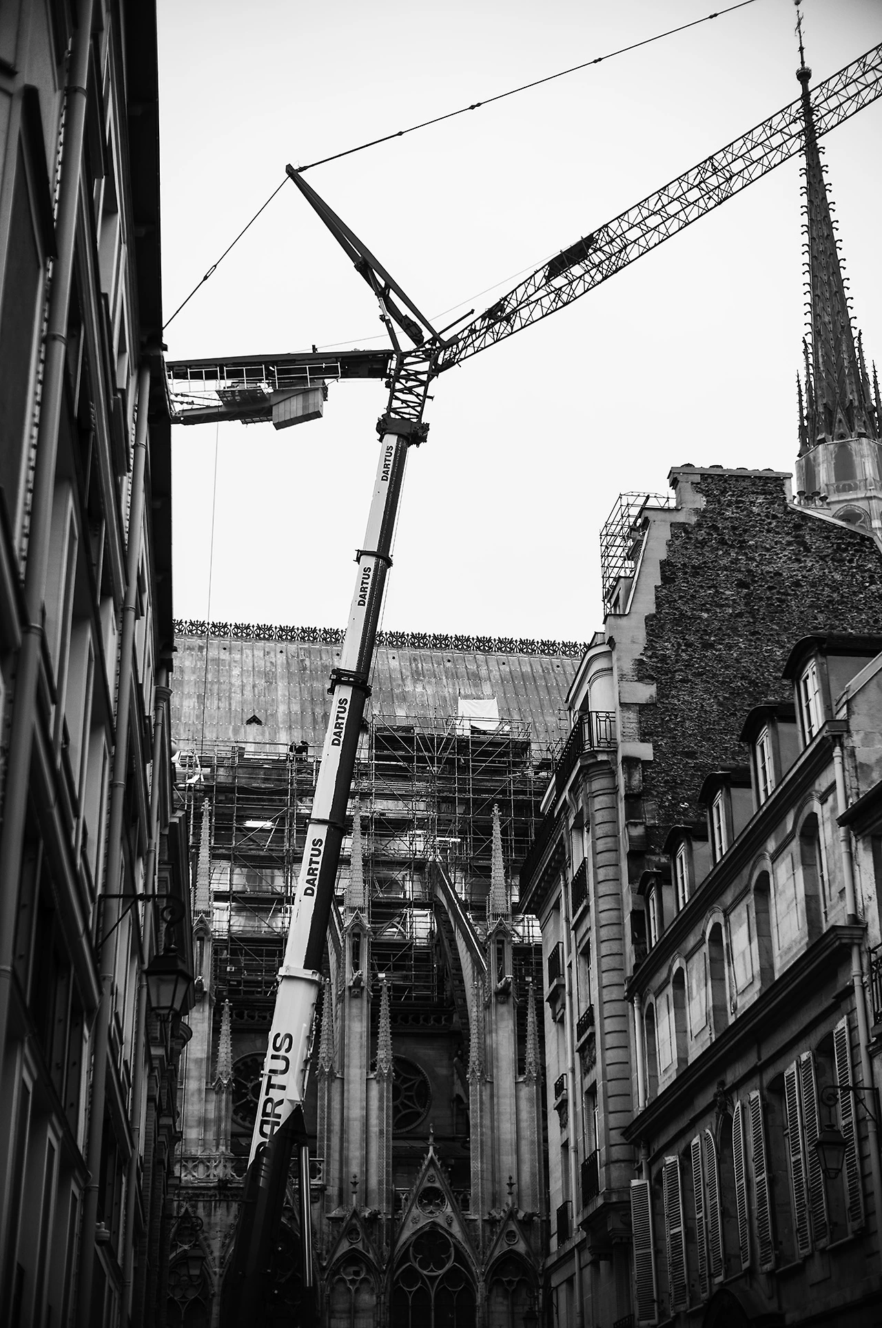 번잡스러운 메인 스트릿을 벗어나 골목길로 들어서니 너무나 예쁜 가게들과 집들이 보이기 시작했고 조금 더 걸으니 역시나! 노트르담의 공사 현장이 보이기 시작했다. 커다란 크레인과 공사 트럭들, 헬멧을 쓰고 일하는 인부들이 조용한 주택가의 고요함과 뒤섞이기 시작했다.