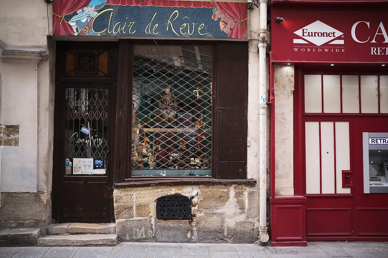 그로서리를 나와 일 센 루이의 메인 스트리트를 위아래로 죄다 훑었다. 그곳에는 지난 이십 년 동안 새로 생긴 가게들이 반, 옛날 그대로의 가게들이 반 정도로 채워져 있었다. 그중에는 내가 그 옛날에 모자를 샀던, 여전히 모자를 파는 상점도 여전히 영업 중 있었고 칼라풀한 디자인 오브제 같던 일본풍의 플라스틱 그릇을 팔던 곳도, 가게가 온통 치즈로 뒤덮인 치즈 가게도 여전히 남아 있었다. 맛있는 잼을 팔던 가게는 팬시한 오르가닉 그로서리로 변신하였고 밤마다 흥청대던 술집은 달콤한 캔디 가게로 바뀌었지만 그중 가장 기억에 남았던 항상 문이 닫혀 있던 마리오넷 인형을 팔던 가게는 여전히 셔터가 내려져 있었고 여전히 마리오넷 인형이 진열되어 있었다. (첫 번째 사진)