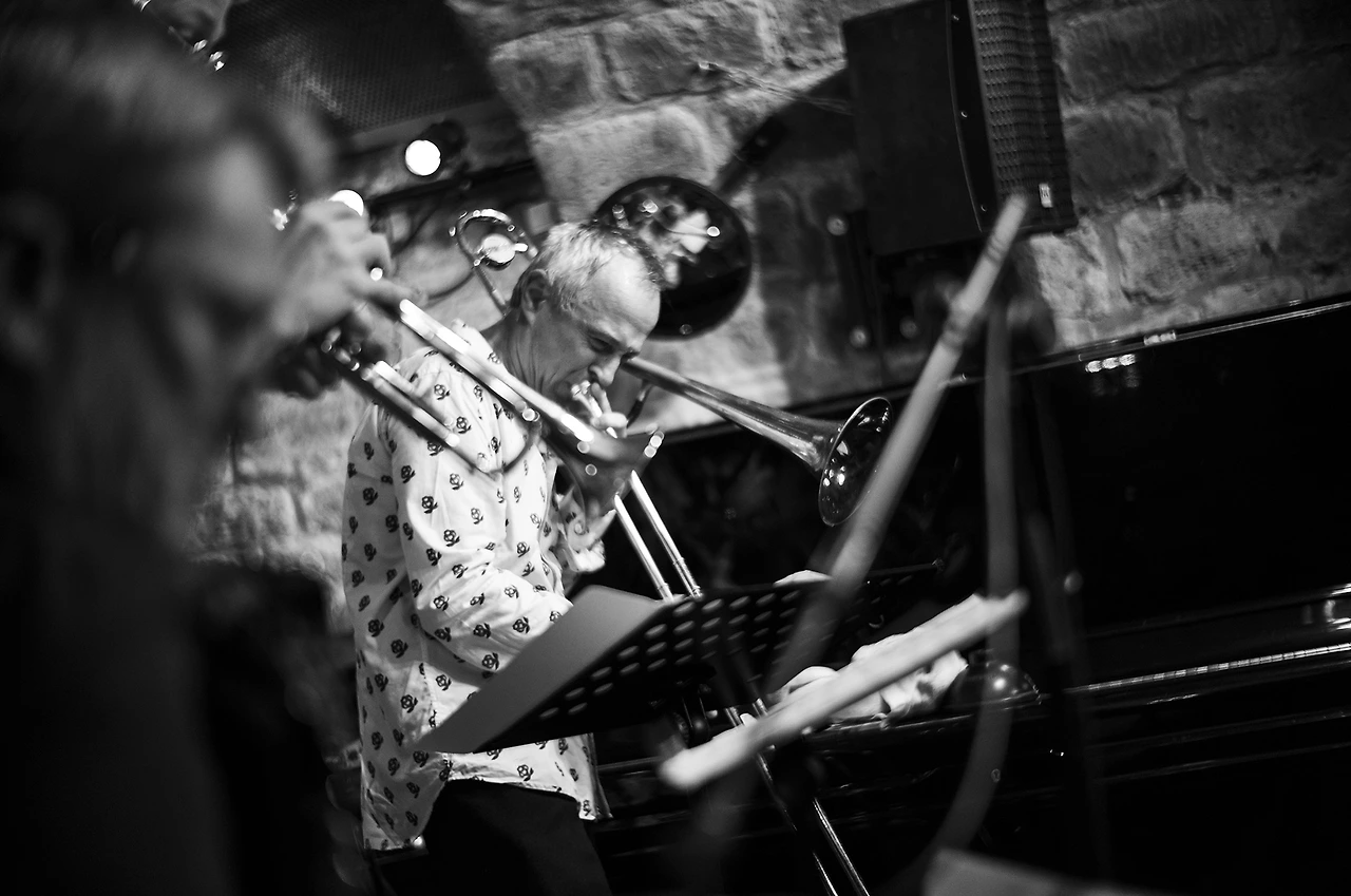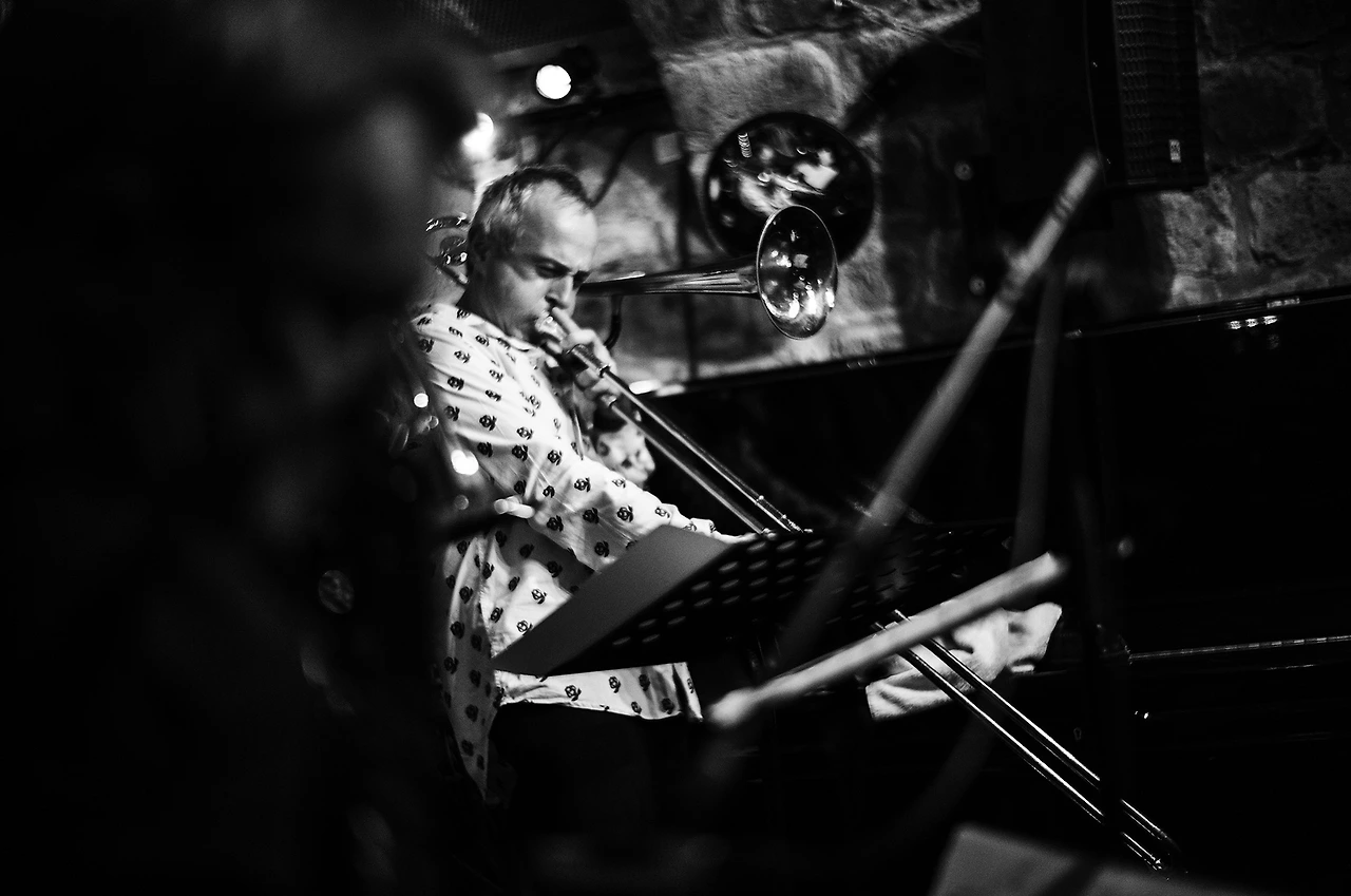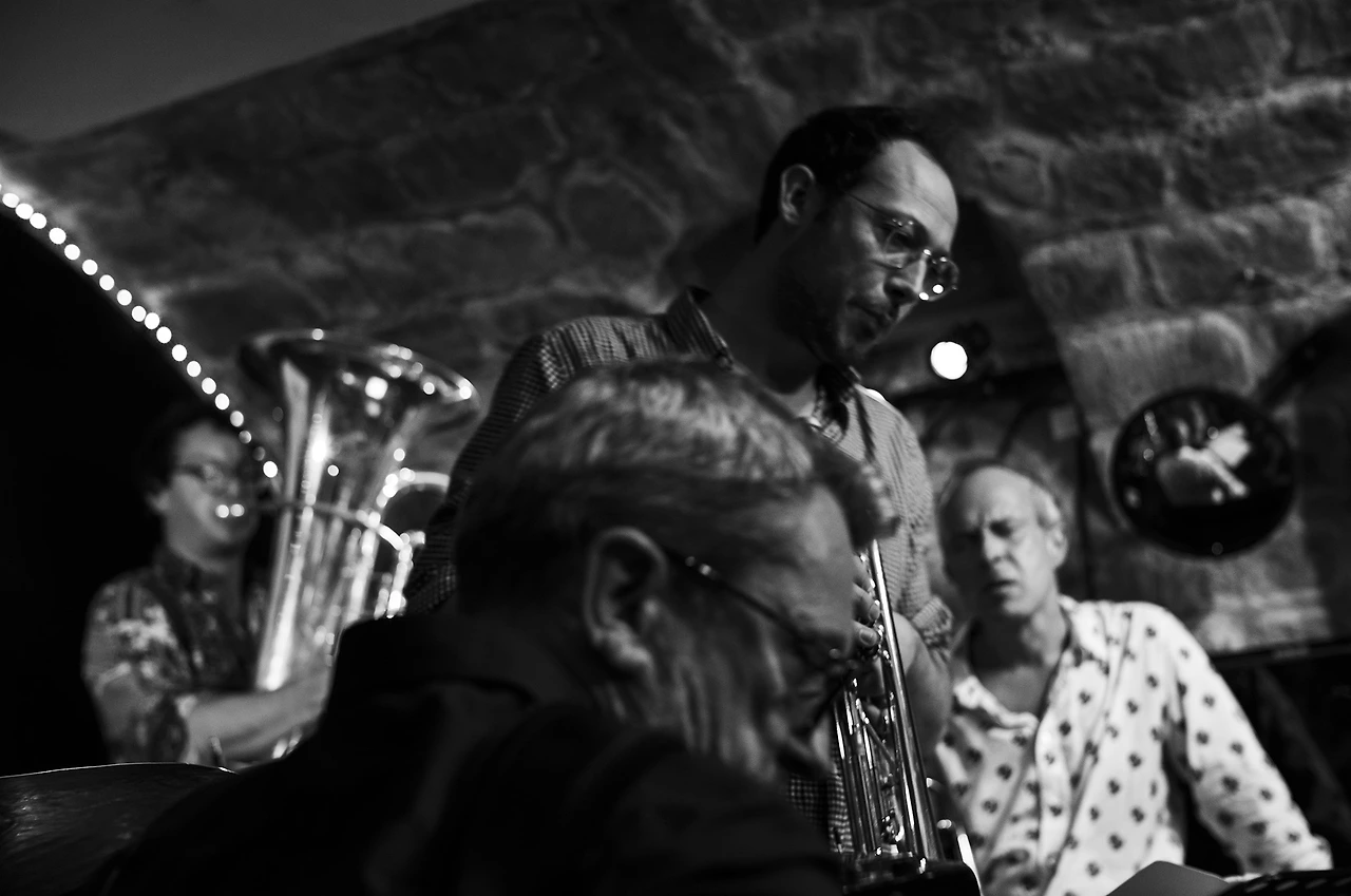 내가 앉은자리는 무척 좁았고 몸을 조금이라도 움직인다는 건 생각도 못할 정도로 옆사람과 붙어 앉았지만 이게 나에게 주어진 최선이라 생각하고 여기서 할 수 있는 만큼 잘 찍겠노라 마음먹었다. 예정된 아홉 시 반이 되자 깨끗하게 잘 다림질한 스타일리시한 꽃무늬가 적당히 들어간 흰색 포플린 셔츠를 입은 중년의 트롬본 연주자이며 팀의 리더인 Gueorgui Kornazov 가 나와서 인사를 하고 트럼펫, 아코디언, 튜바, 드럼으로 짜인 그의 Brass Spirit Stet의 공연이 한 시간 동안 진행되었다.