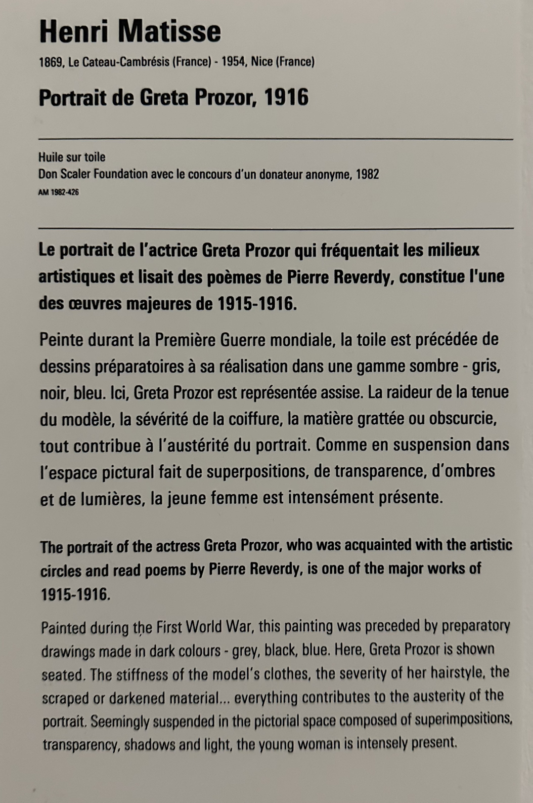 전날 그곳에서 다시 본 마티스의 그레타도 그녀에 대해서 오랜 기간 동안 많이 찾아봐서 어느 정도는 친숙하다 생각했었는데 작품 설명이 쓰인 플라크에는 처음 알게 된 정보들도 꽤 있었다. 특히 그녀의 모습이 “intensly present” 하다는 표현은 첨 읽는 것이었다. 이런 식의 주관적인 감상을 손바닥만 한 그림 설명서에 자신 있게 넣을 수 있는 연구자라면 그의 작가에 대한 지식이나 그림을 보는 안목이 수준급을 넘어서 세계적이어야 가능하다는 생각이 들었으니까. 학부에서 부전공으로 미술사를 공부했던 아들이 손바닥 만한 그림 설명 한 장을 완성하기 위해 한 학기를 보냈던 기억이 떠올랐다. 쉬운 작업이 아니었다. 자기가 쓰려는 작가의 전 생애를 꿰뚫어야 그 한 장의 설명서가 간신히 나올 수 있었다 하였다. 근데 이곳의 작품 설명서들은 하나하나 세계적이면서 모두 다 모아 놓으면 잘 꿰인 구슬같이 조화로웠고 아름다웠다.