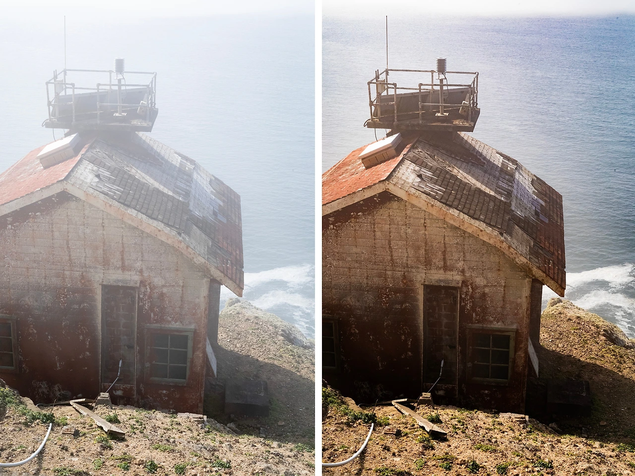 확실히 달랐다. 하다못해 삼 년 전 친구랑 샌프란시스코 근처에 있는 포인트레이 국립해변공원 (Pt Reyes National Seashore)에 갔을 때 찍어 두었던 등대 옆 건물의 사진도 왼쪽의 밍밍하던 것을 오른쪽의 콘트라스트가 훨씬 더 있는 모습으로 바꿀 수 있게 되었다. 무슨 굉장한 것은 아니더라도 조금은 더 분위기 나는 사진을 보니 괜히 찍은 것은 아니었구나 하는 생각이 들었다.