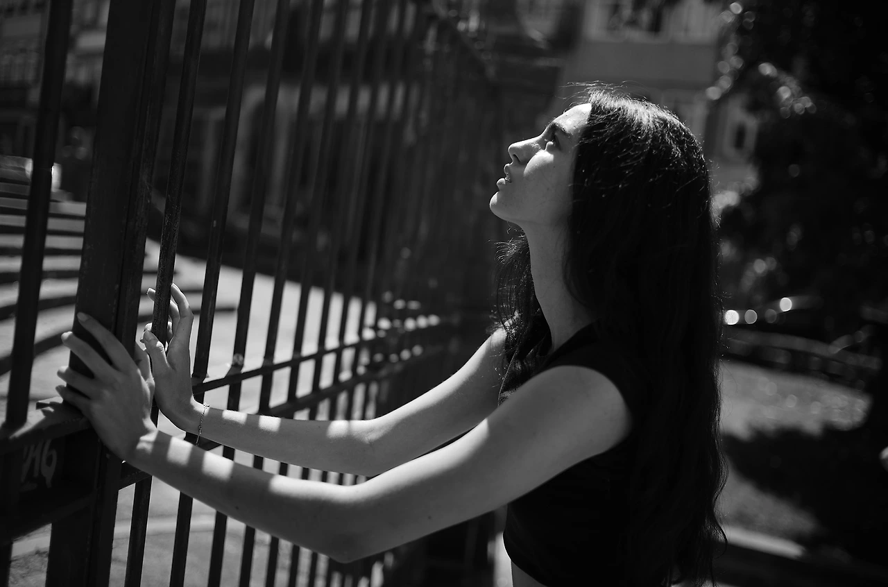 사진설명: 아래 다섯 장의 사진들은 성당 문이 닫혀버려 안으로 들어가지 못하고 펜스밖에서 찍은 장면들. 햇볕이 유난히 강해서 철장의 그림자가 모델의 얼굴에 떨어지는 것을 보고 그 효과를 반영해 보자는 생각이 들었다. 스토리 타이틀은 “거부당한 마음“?
