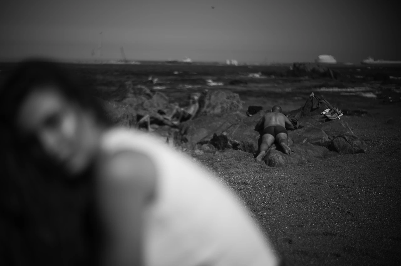 사진에는 자신의 모습이 남에게 어떻게 보일지에 대한 관심은 일도 없는 반나의 엎드린 중년 남성의 모습과 머리부터 자신을 곱게 감싸고 조신하게 앉아있는 젊은 여인의 모습이 대비되어 있다. 이 모습이 무슬림의 나라인 모로코에서 내가 느꼈던 남녀의 차이였다. 그때 찍지 못했던 광경을 두 주 후, 포르토 해변에서 만났던 것이었다.