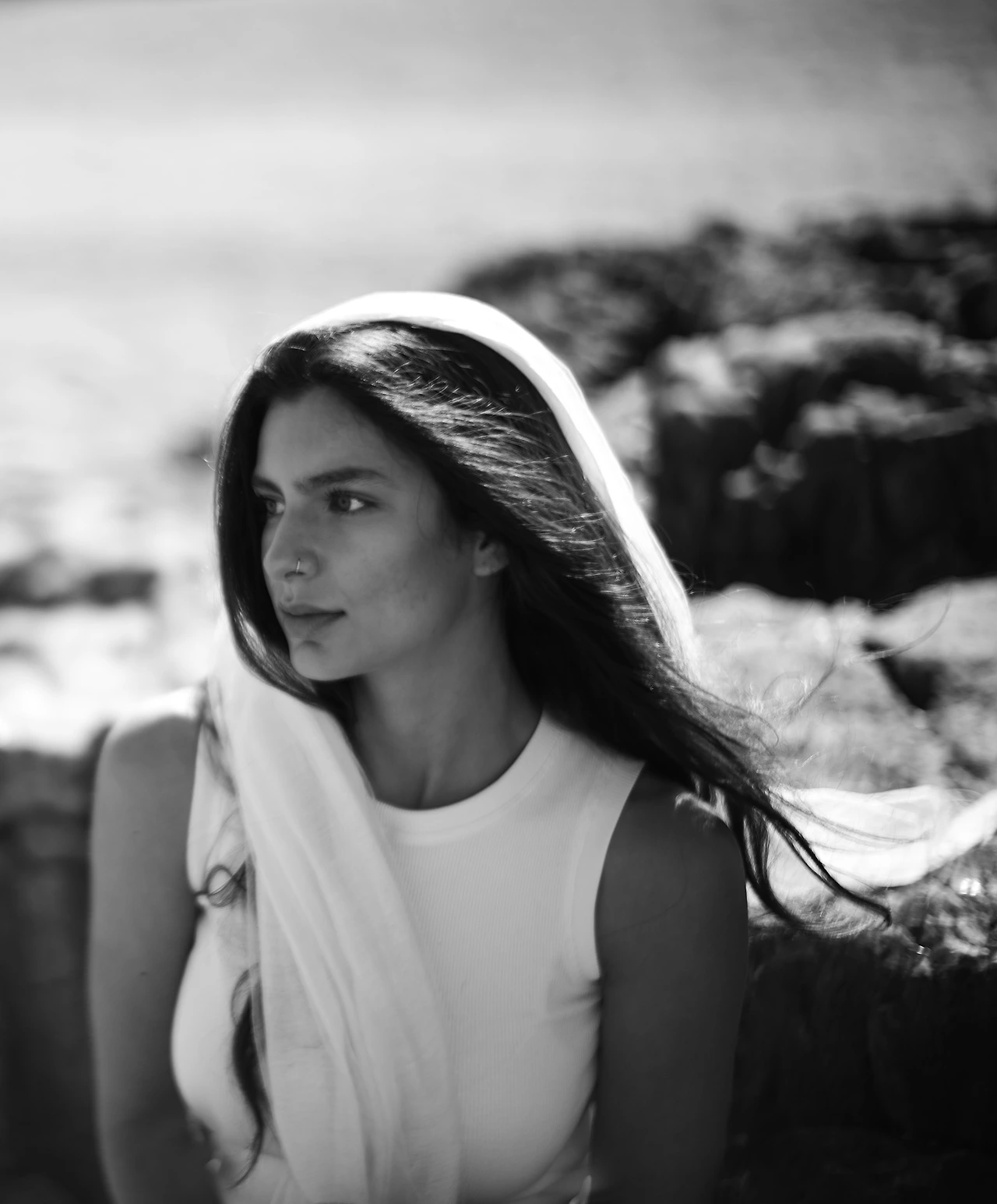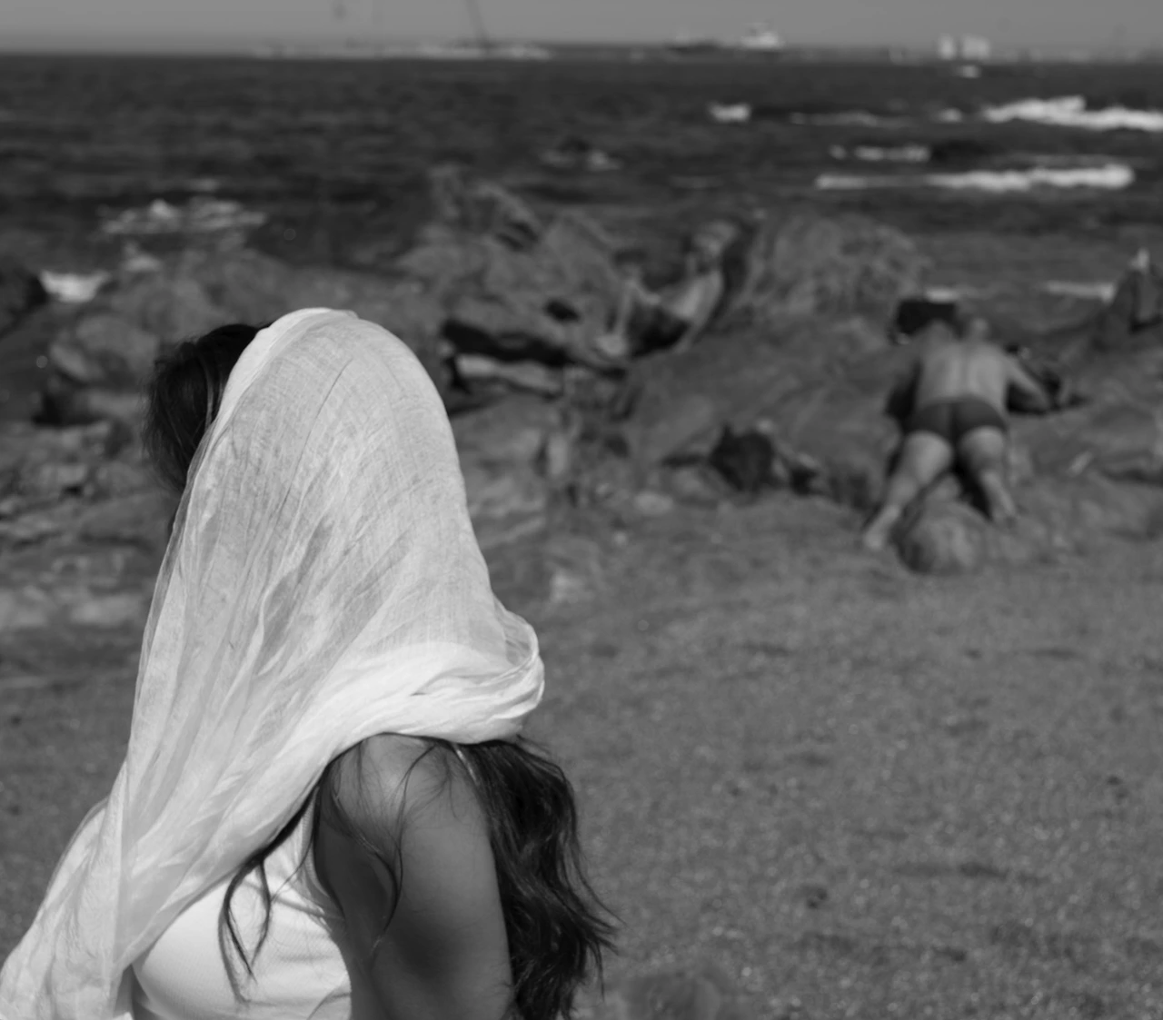 해변에는 두 명의 이십 대 안팎의 패션모델들이 우리를 기다리고 있었다. 그중 E는 흑인인 듯 보였고 C는 남유럽 풍으로 약간은 북아프리카 여인의 모습도 풍겼다. 둘 다 개성이 있었고 멋졌고 아름다운 아가씨들로 어떻게 찍든 잘 나올 수밖에 없는 프로필이었다. 옷은 기본적인 무채색 위주여서 내 흑백 사진기에도 잘 맞았다. 그동안의 경험덕에 미리 준비해 갔던 하얀색의 반투명한 머플러도 도움이 되었다. 이래저래 한번 해 보았던 해변 촬영이라 훨씬 편안하게 진행할 수 있었다.