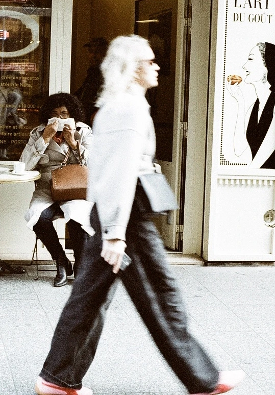 이 사진의 원래 의도는 뒷배경의 흑인 아줌마를 찍는 것이었어요. 그래서 한 2-3초 정도 지체하며 그녀로 초점을 맞춰놓고 셔터를 누르려는 찰나 그녀 앞에 멋진, 아니 ”간지 나는“ (친구의 말로…) 다른 아줌마가 휙하니 지나가는 거예요. 화들짝 놀라 무조건 셔터를 눌렀네요. 파리에서 필름을 현상하고 돌아오는 비행기를 타기 바로 전에 받은 스캔입니다. 생각보다 훨씬 잘 나왔어요. 빨간 운동화도, 은발의 머리카락도, 펑퍼짐하지만 아주 트렌디한 바지도, 그 뒷배경의 간판도 본 기억이 없습니다. 그냥 감으로 셔터를 눌렀을 뿐입니다. 놀래서.
