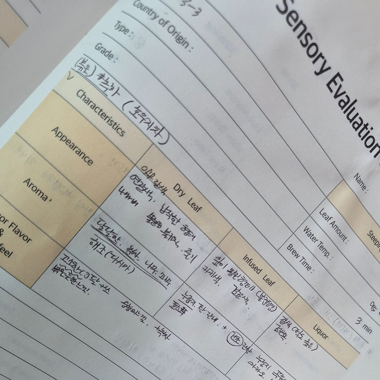 이때 차의 건옆(마른 찻잎), 엽저(젖은 찻잎), 수색 (차 우림물의 색) 등 모양, 색, 향 등 오감으로 파악할 수 있는 정보들을 파악해 나가며 테이스팅 차트를 기록해 나갔다.