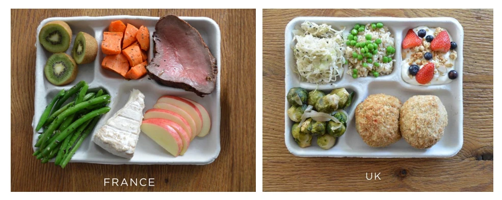 3. 급식이 더 맛난다. 사실 (아래 사진과 다르게) 지나치게 기름진 음식이 많은 편이라 신경 쓸 부분입니다. 일주일 몇 번 핫도그나 감자튀김(Chips라고 불림)이 나옵니다. 결국 아이들은 신난 거죠. 반면 프랑스는 음식에 진심임이, 학교 급식에서도 나타난다고 합니다. 식재료가 다양하고 포멀 하죠!!