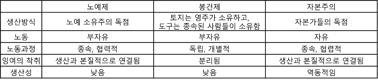 뒤랑은 봉건주의의 재등장을 확인하기에 앞서 “봉건주의란 무엇인가?”를 먼저 다룬다. 봉건주의와 관련된 여러 학자의 논의를 다양하게 다루지만, 그 결론은 하나의 표로 압축될 수 있다(표1).