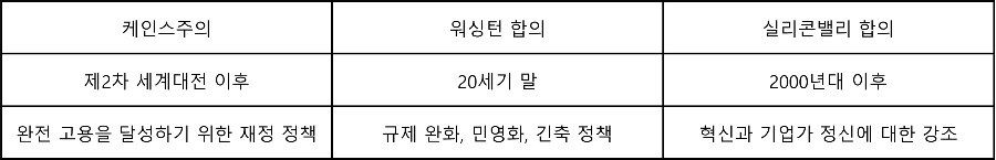 뒤랑은 워싱턴 합의를 넘어선 실리콘밸리 합의를 설명하고, 그 기반이 되는 캘리포니아 이데올로기2)의 모순을 지적하면서 책을 시작한다.3) 뒤랑에 따르면, “이 교리[실리콘밸리 합의 – 필자]는 시장을 통한 자원 배분의 정적 효율성보다 창조적 파괴를 특징으로 하는 자본주의의 동적 효율성에 더 중점을 둔다. 이를 통해 교리는 안정화-자유화-민영화라는 삼중 구도를 넘어 인센티브 문제를 중심에 두며 그 처방의 범위를 확장한다. 따라서 공공 개입의 절제, 기업가적 에너지의 해방, 상품‧노동‧자본 시장의 유연성, 혁신가의 재산권 보호라는 원칙들이 실리콘 밸리 합의의 특징적인 공공 정책 방향을 이끈다.”(50) 말하자면, 실리콘밸리 합의는 “워싱턴 합의를 계승하면서도 기술 낙관주의라는 질적 요소를 추가적으로 결합”한다(47).