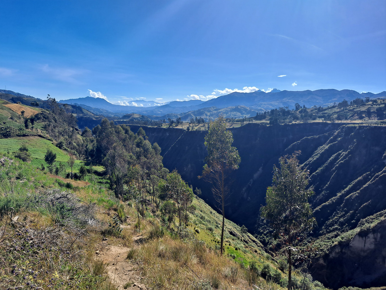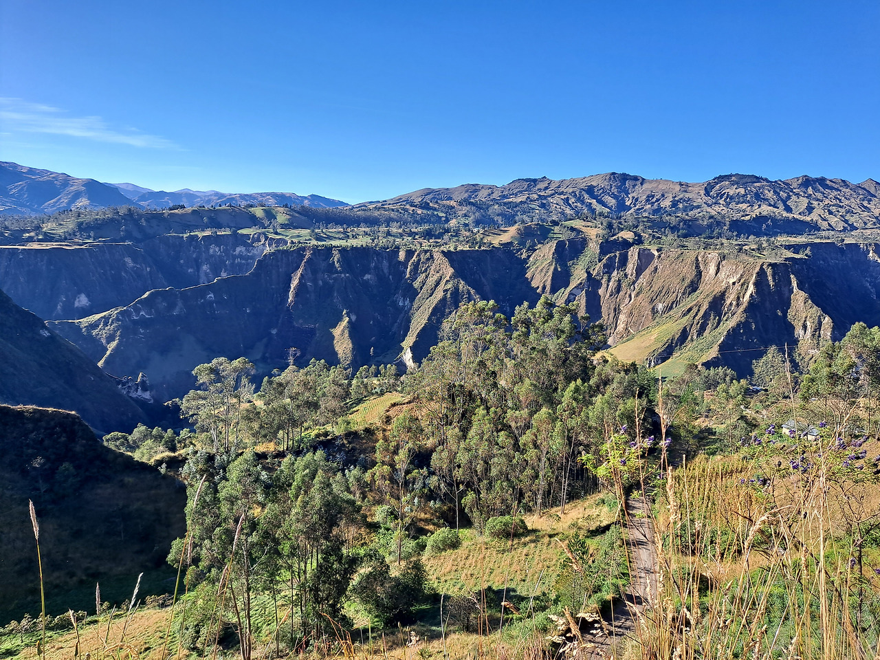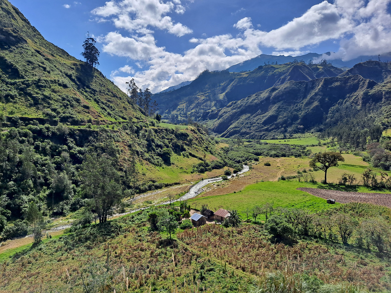 트래킹 코스가 안데스 토착민들의 마을과 경작지를 가로지르기 때문에 정말 별의별 가축을 다 보고 현지인들도 정겹게 인사를 건넨다. 깎아지른듯한 지형에 차로 들어가기도 힘든 위치에 들어선 집들을 보며 도대체 이 사람들은 어떻게 식료품과 생필품을 조달할지 궁금해진다. 가는 길에 네덜란드인 1명, 그리고 처음 Sigchos로 오던 버스에서부터 있던 호주인 1명과 동선이 겹쳐 동행이 되었다. 1일 차는 대부분 쉬운 길이었지만 협곡을 타고 올라가는 40분여간의 등산이 강한 임팩트를 남겼다. 애초에 이 트래킹 자체가 매일매일 시작하는 마을에서 협곡을 내려간 다음, 다음 마을로 올라가기 위해 협곡을 올라가는 코스로 구성이 되어있다. 3일 차가 되면 협곡을 2개 가로지르고 마지막으로 화산 정상으로 올라가야 하기에 미친 오르막을 경험하게 된다. 그래도 이 사실을 모르는 1일 차의 나는 '좀 힘들긴 한데 이 정도면 뭐 껌이네'라고 생각한다.
