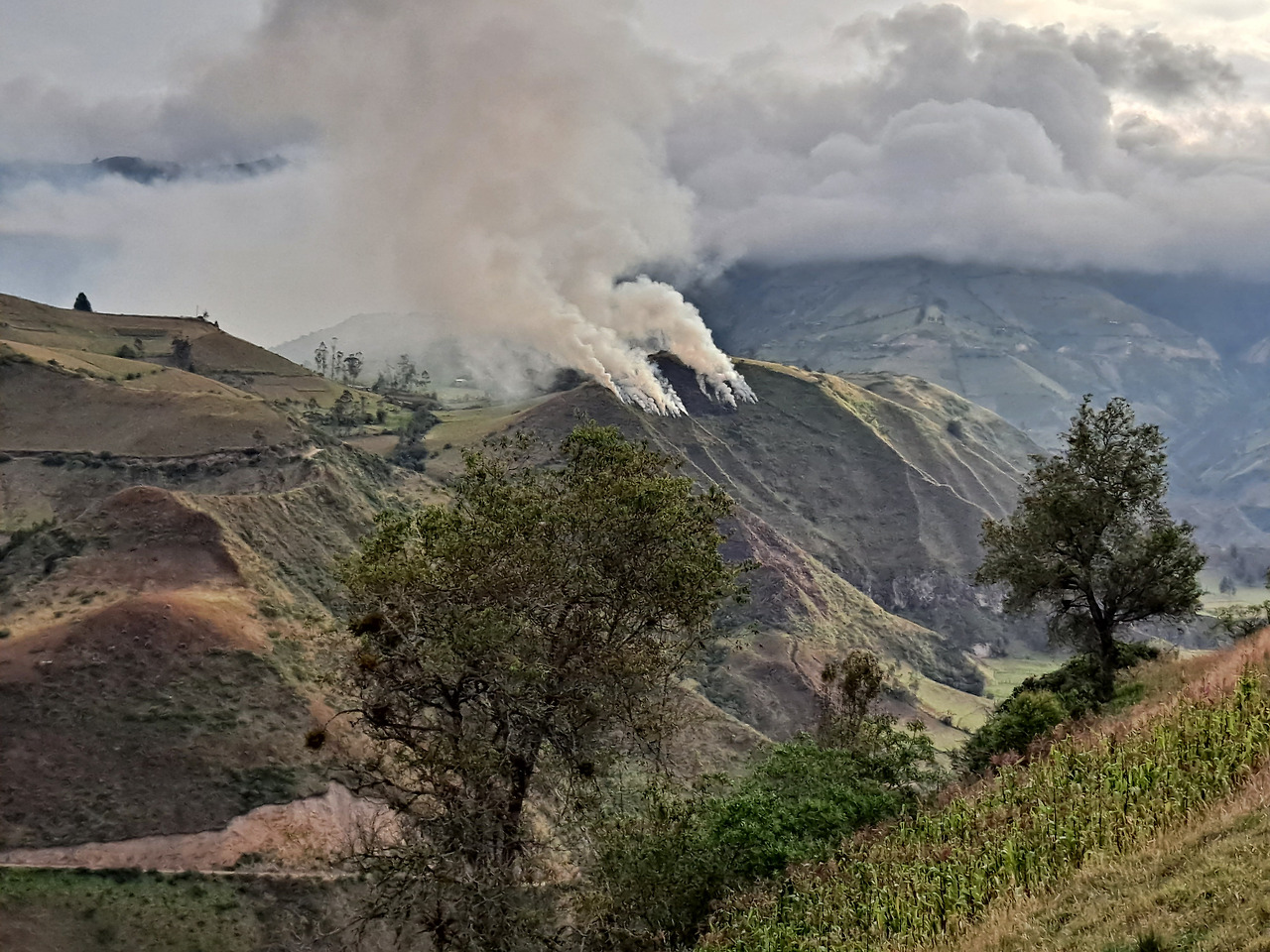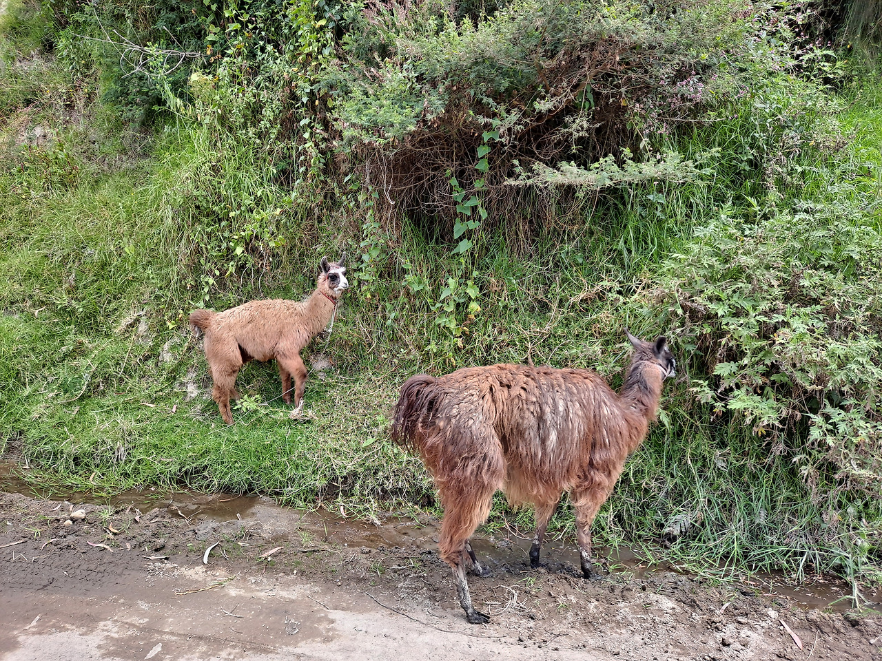 이틀차는 Isinliví에서 Chugchilán이라는 마을로 가는 4시간짜리 코스였다. 오늘은 전날 숙소에서 만난 호주, 멕시코, 스위스 동행과 함께 총 4명이 함께했다. 시작은 역시 1시간 정도 내리막을 걸어 협곡의 바닥으로 향한다. 산에서 연기가 솟는 것을 보고 아마 화전농업을 하는 것이라 짐작했다. 산 넘고 물 건너 한 채씩 서 있는 집들을 지나다 보니 좁은 내리막에 들어서는데 바닥이 진흙이다. 모르고 밟아서 신발과 바지가 진흙범벅이 된다.