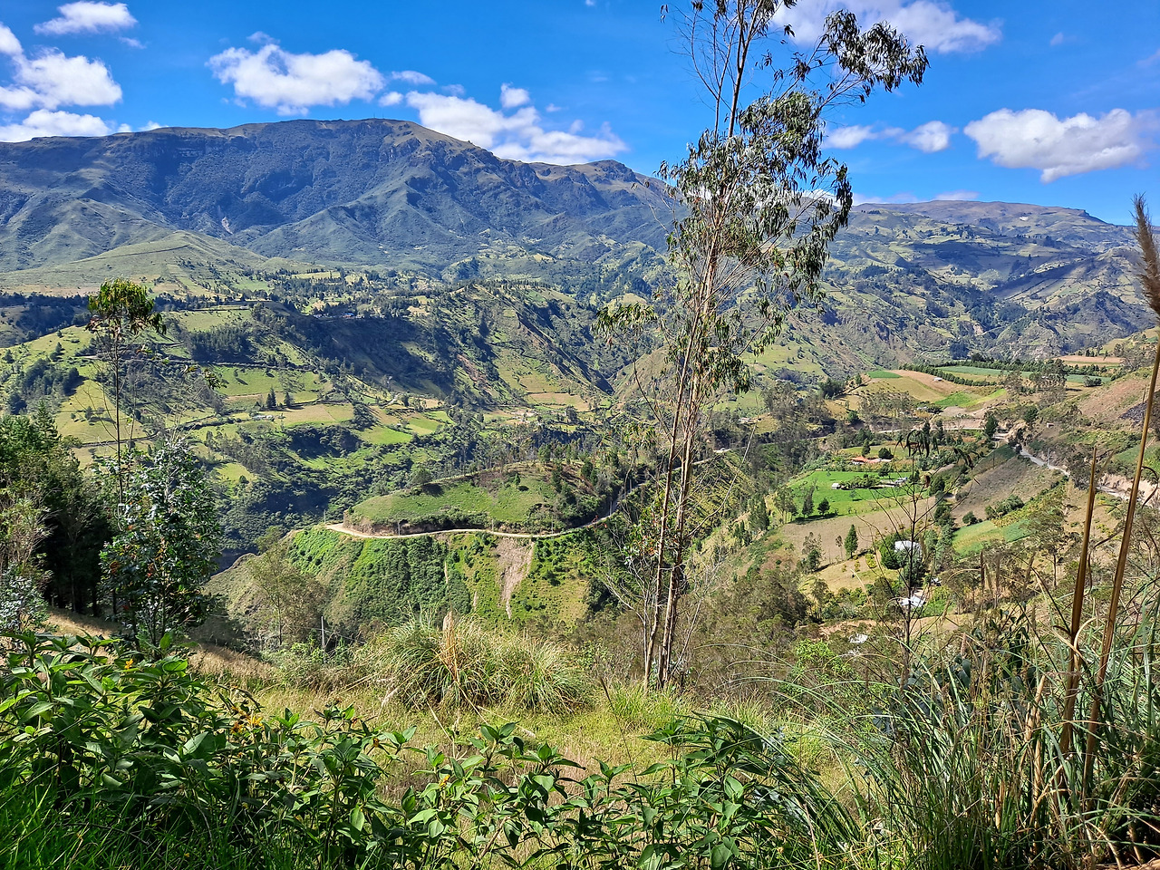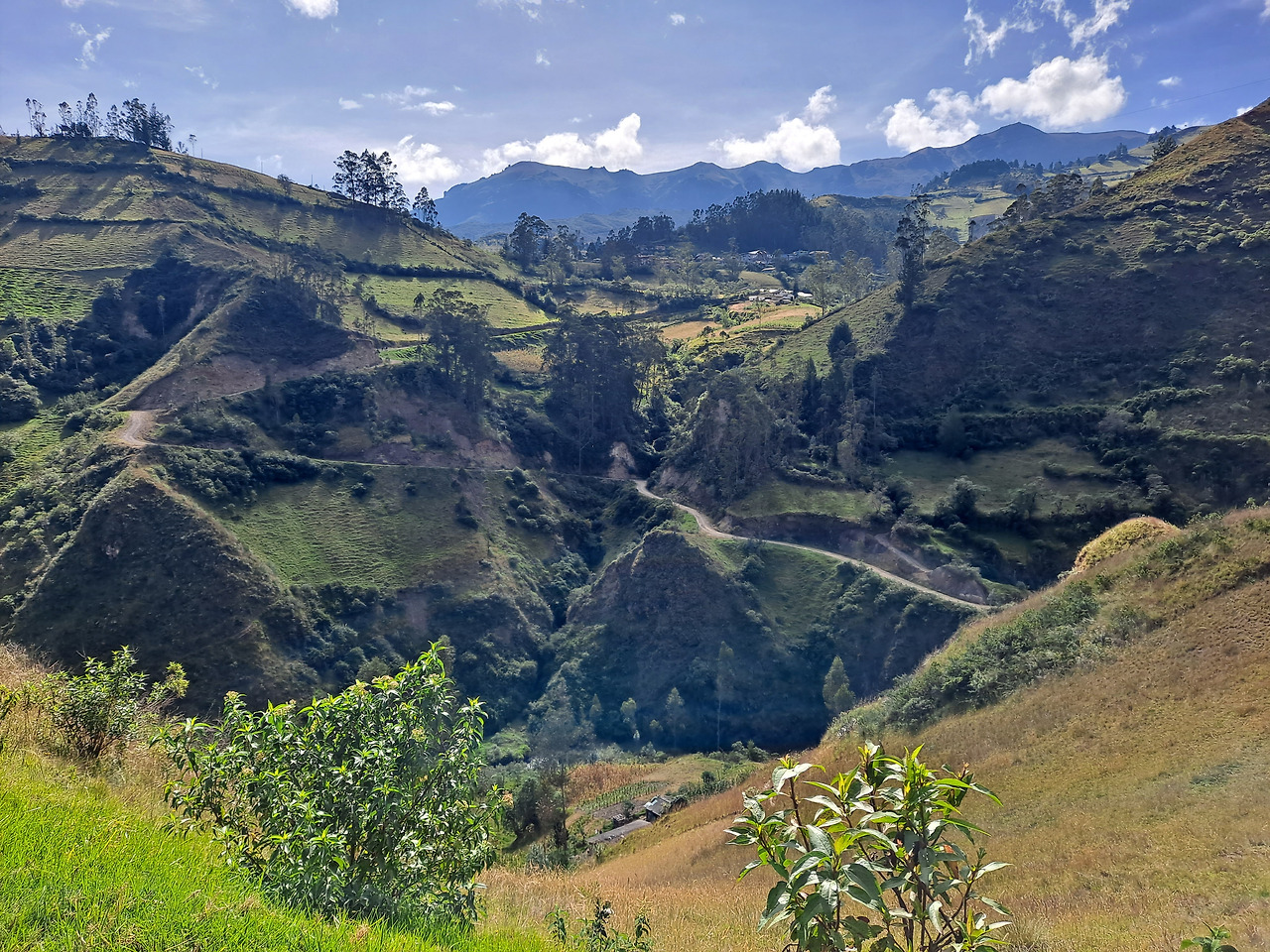 킬로토아 트래킹은 Sigchos라는 안데스 산맥의 작은 마을에서부터 시작해 매일 15km 정도를 걸어 해발 약 4000m에 있는 킬로토아 호수를 찍으며 마무리된다. 첫날은 거점이었던 라타쿵가에서 아침 8시 버스를 타고 2시간여를 꼬불꼬불한 산길을 지나 Sigchos에 도착하며 시작된다. 버스에서 보는 안데스의 풍경이 벌써부터 예술이었지만 피곤해서 조느라 제대로 감상하지는 못 했다. 어차피 3일 내내 트래킹 하면서 볼 풍경이라 딱히 후회하지는 않는다. Sigchos는 왼쪽 사진에서 보듯이 정말 별거 없는 마을이고 나는 라타쿵가에서 점심거리도 사 왔기 때문에 스킵하고 바로 트래킹 코스로 들어섰다. 마을을 가로지르고 산길을 내려가자마자 달력경치가 펼쳐진다. 사진은 평면이라 입체감이 덜하지만 실제로 보면 정말 깊은 협곡 사이사이 마을과 오솔길이 들어서 있는 모습이 장관이다.