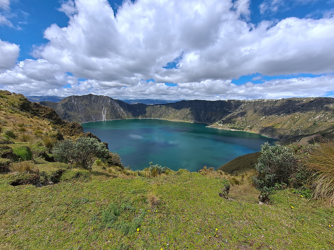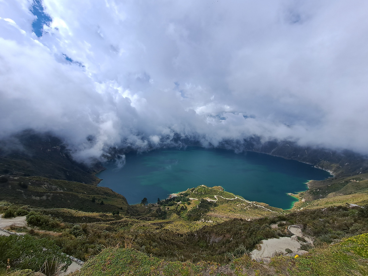 오늘도 여전히 달력경치를 지나 작은 마을들도 여럿 지나며 길을 이어갔다. 중간중간 옆이 절벽이라 걷기 무서운 좁을 길들도 지나야 했다. 에콰도르 산간 지역은 아침 날씨는 좋지만 정오가 넘어가면 구름이 산을 뒤덮기에 빨리 올라가서 호수를 봐야 한다는 생각도 있었다. 동행들은 이미 앞에 멀어진 터라 혼자 천천히 마지막 봉우리로 올라가는 급경사 코스를 올라갔다. 트래킹 3시간이 지나니 땀도 너무 많이 나고 배고 고파 탈진 상태에 들어섰다. 군대에서도 행정병으로 나름 큰 육체적 고통을 느껴본 적이 없었는데 여기서 인생 최대의 힘듦을 경험했다. 마침 중간에 동행도 너 군 전역하고 바로 와서 별로 안 힘든 것 아니냐고 얘기해서 난 실내에서 타자나 치는 행정병이라 그딴 거 모른다고 했다.