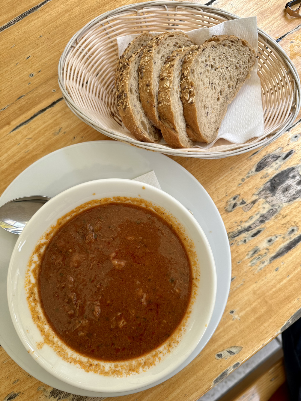 그리고 내려와서 먹은 점심. 오늘은 늦게 나왔기때문에 점심도 약간 늦게 먹었어요. 햄버거와 굴라쉬, 피칸테피자를 시켜서 나누어 먹었습니다. 그런데 여기 음식, 원래 이렇게 짜나요? 평소에도 조금 짜게 먹는 편인 제가 음식이 짜다고 할 정도면 어떤 정도인지 아시겠죠? ㅎㅎ 어쩔 수 없이 맥주와 음료를 곁들여 먹을 수 밖에 없는 구조... (음식을 더 팔기 위한 상술인 것인가...ㅋㅋ)