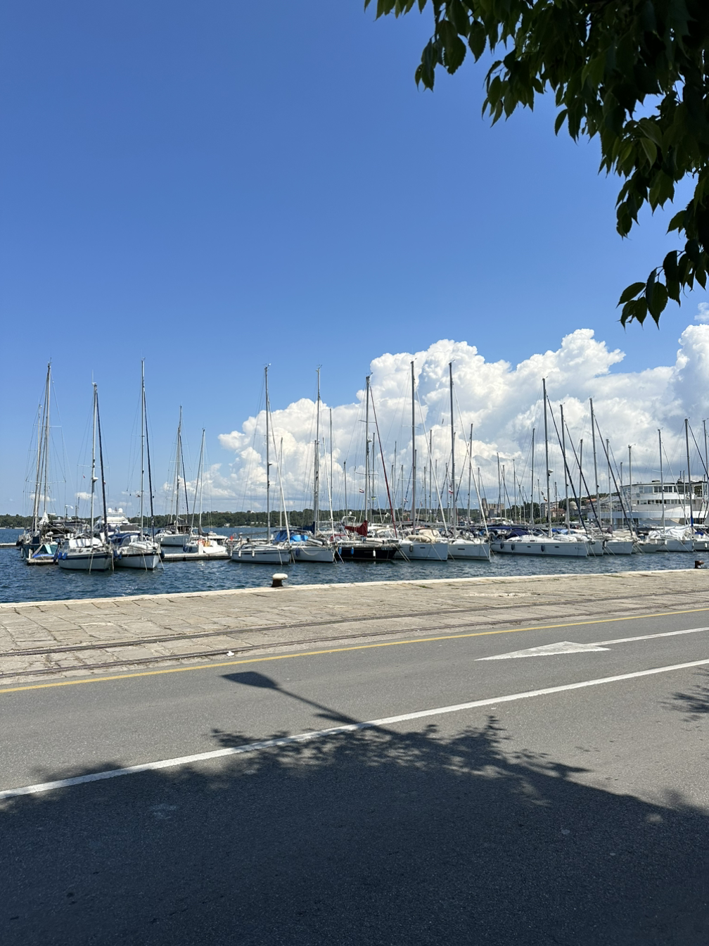 성모승천성당에서 나와 옆을 보면 바로 이렇게 멋진 해안가가 보입니다. 이 도시의 사람들은 주로 요트를 타고 여름을 즐기는 것 같아요. 쭈욱 늘어선 요트를 보는 것만으로도 마음이 뻥 뚫리는 것 같았어요. 그리고 뜨거운 해 때문에 어떻게 돌아다니나 많이 걱정했는데 그늘로 들어가면 언제 그랬냐는 듯이 바람이 불고 선선했습니다. 지금 사진작가님과 지노그림 작가님 모두 그늘을 찾아 걸어 다녔어요. 해가 있는 곳은 바로 땀이 흐를 만큼 너무 더웠기 때문입니다. 해는 뜨거워도 시원하게 불어오는 선선한 바람 때문에 이곳이 휴양지라는 것이 더 와닿았습니다.
