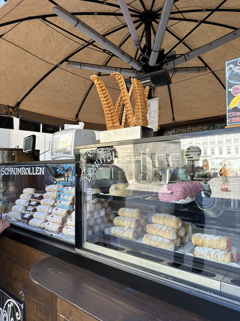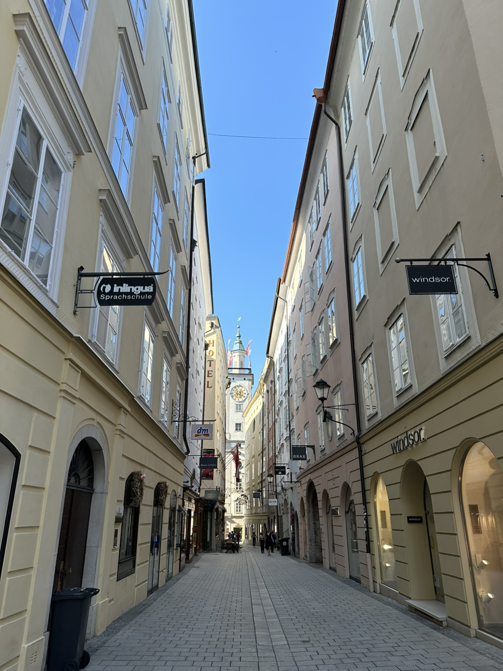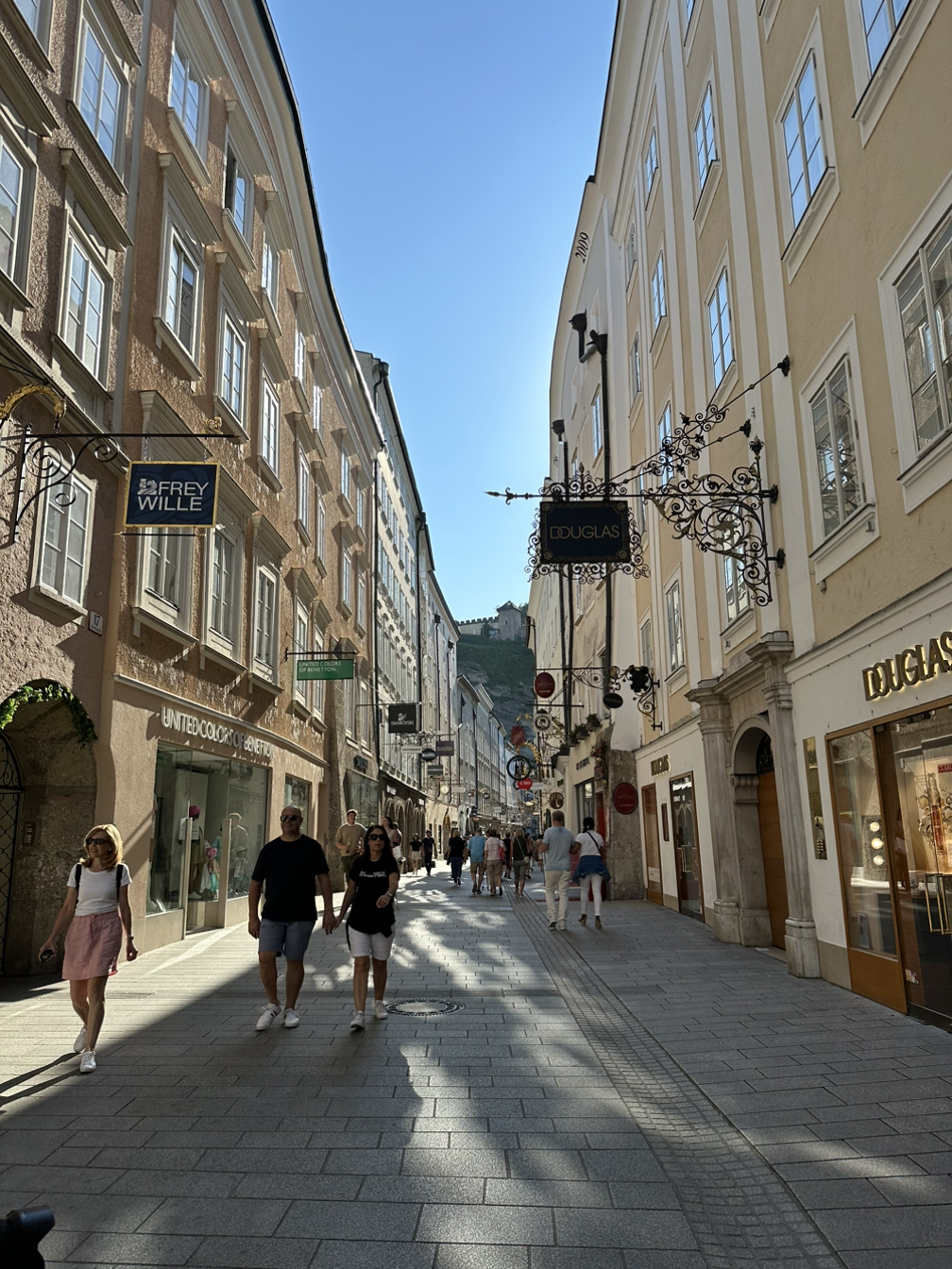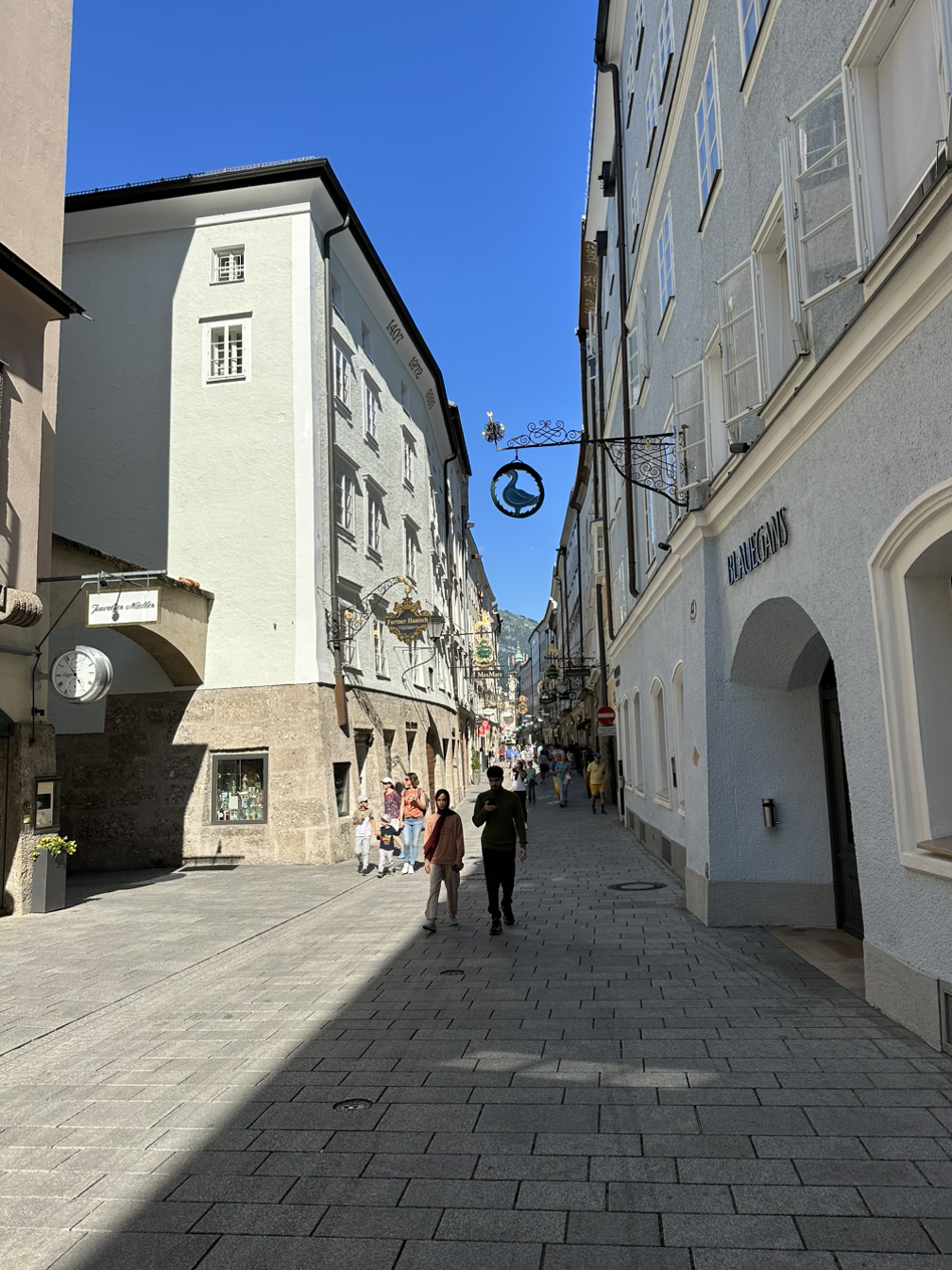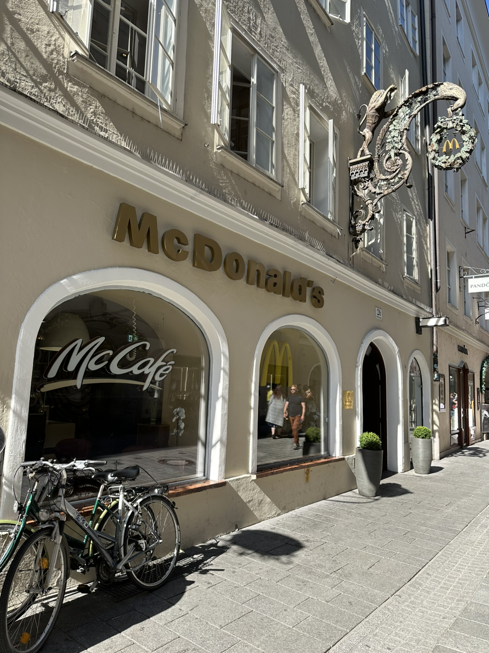 커피를 다 마신 저희는 명품거리를 살펴보기 시작했어요. 잘츠부르크의 골목도 아주 예뻤는데요. 특히 간판들이 특색 있게 디자인되어 있는 것들이 인상 깊었어요. 마지막에 보이는 맥도널드 간판도 아주 멋졌고요. 다만 저희가 갔던 날이 일요일이나 명품거리의 식당과 카페 빼고는 거의 모든 상점이 문을 닫아서 그 부분이 아쉬웠습니다.ㅠㅠ