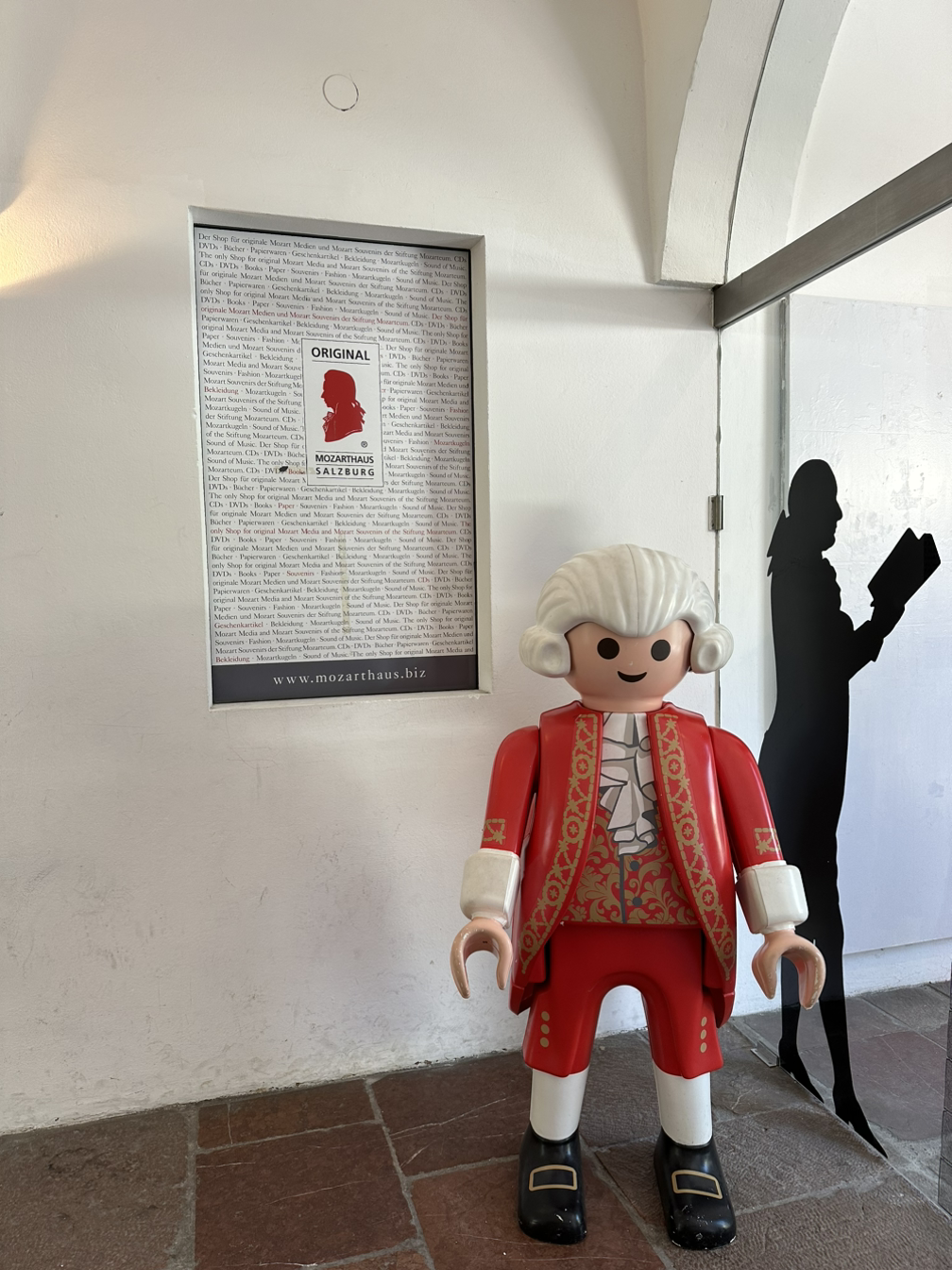 그늘에 몸을 잠시 숨겼다가 찾은 곳은 바로 모차르트의 집이었어요. 모차르트가 7년 동안 살았던 집은 박물관으로 변해있었고, 작곡가의 생애를 살펴볼 수 있는 유물을 전시해 놨다고 합니다. 그런데 입장료가 너무 비싸서 저희는 들어가진 않았어요. 그래도 이렇게 귀여운 캐릭터도 보고, 기념품 샵도 잠시 돌아보고 나왔습니다. 한 사람이 살았던 곳에 대한 기록을 남기는 것이 사실 쉬운 일은 아닌데 잘츠부르크에는 모차르트의 집도 있고, 생가도 있어서 2개나 보존이 잘 되고 있다는 게 대단하게 생각됐어요.