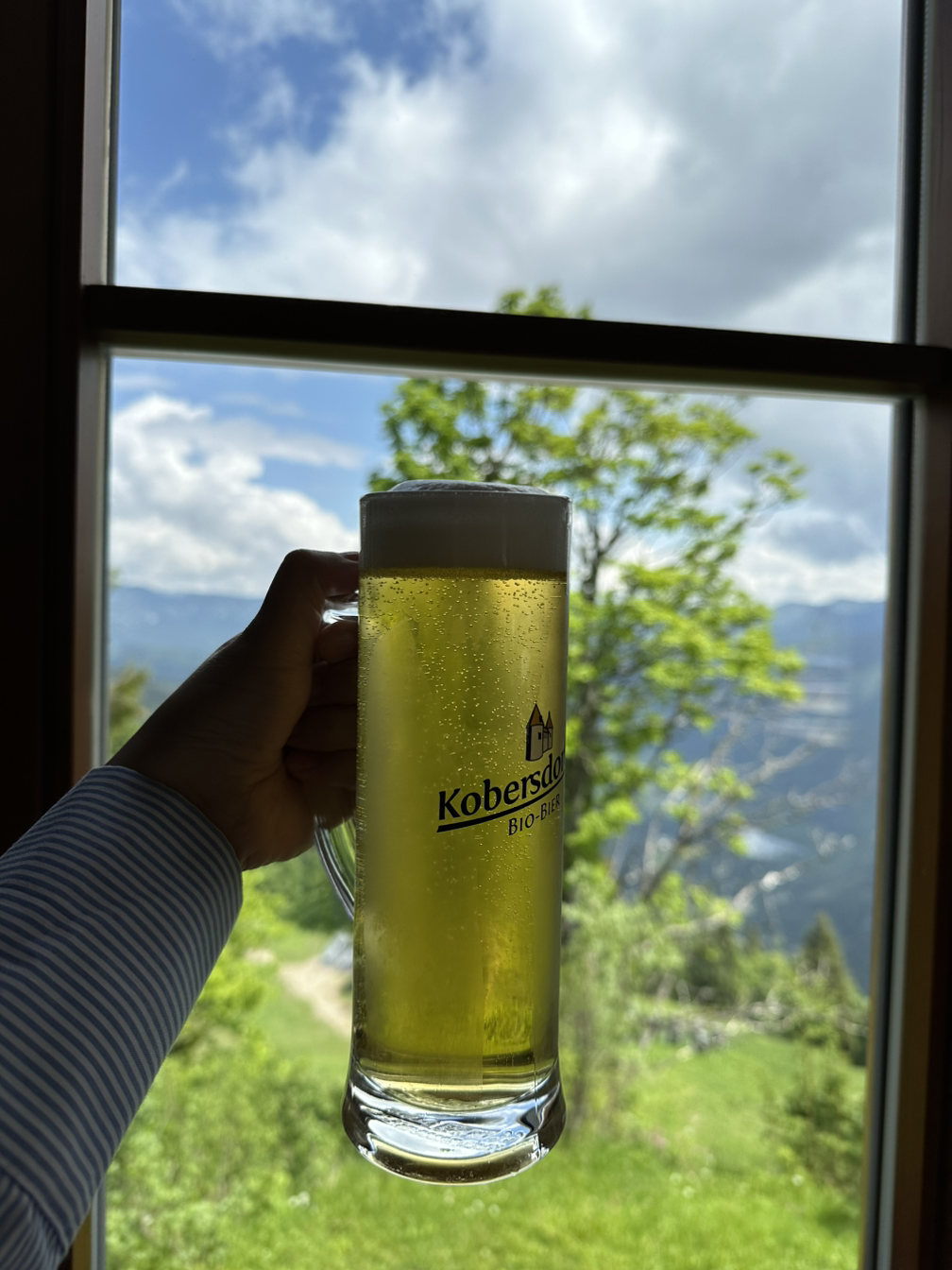 정상에서 한참을 걷기도 하고, 사진도 찍고, 송아지들과 놀기도 하다가 드디어 점심을 먹으러 갔습니다. 지금사진 작가님은 오스트리아의 맥주도 한 잔 하고, 오스트리아의 전통 음식도 먹었습니다. 맨 첫 번째 사진인 콩으로 만든 스튜는 정말 생긴 것과 다르게 너무 맛있었어요. 하지만 언제나 그렇듯 양이 너무 많아서 다 먹지 못하고 남겼습니다.