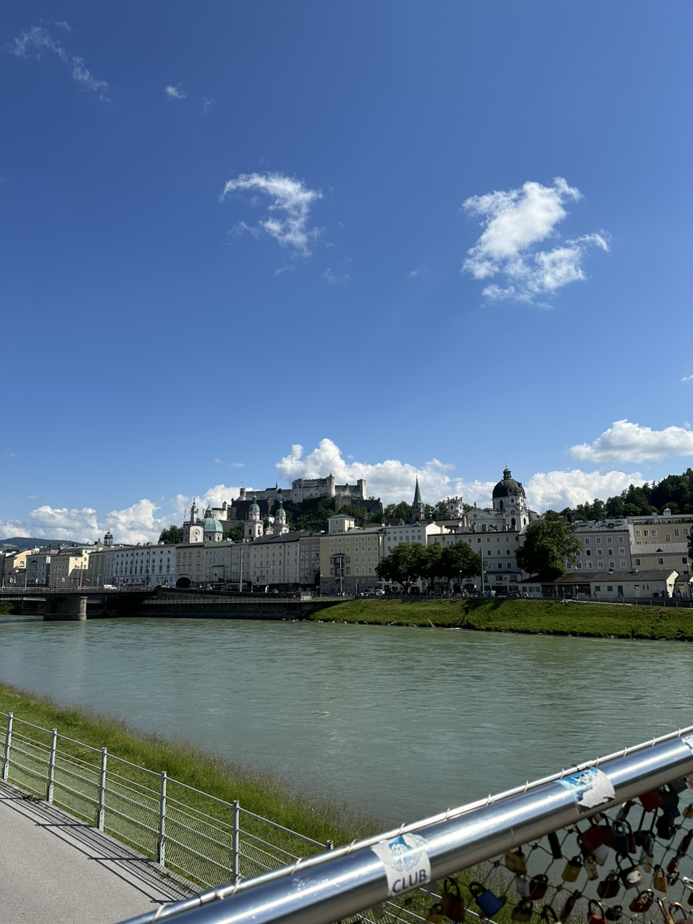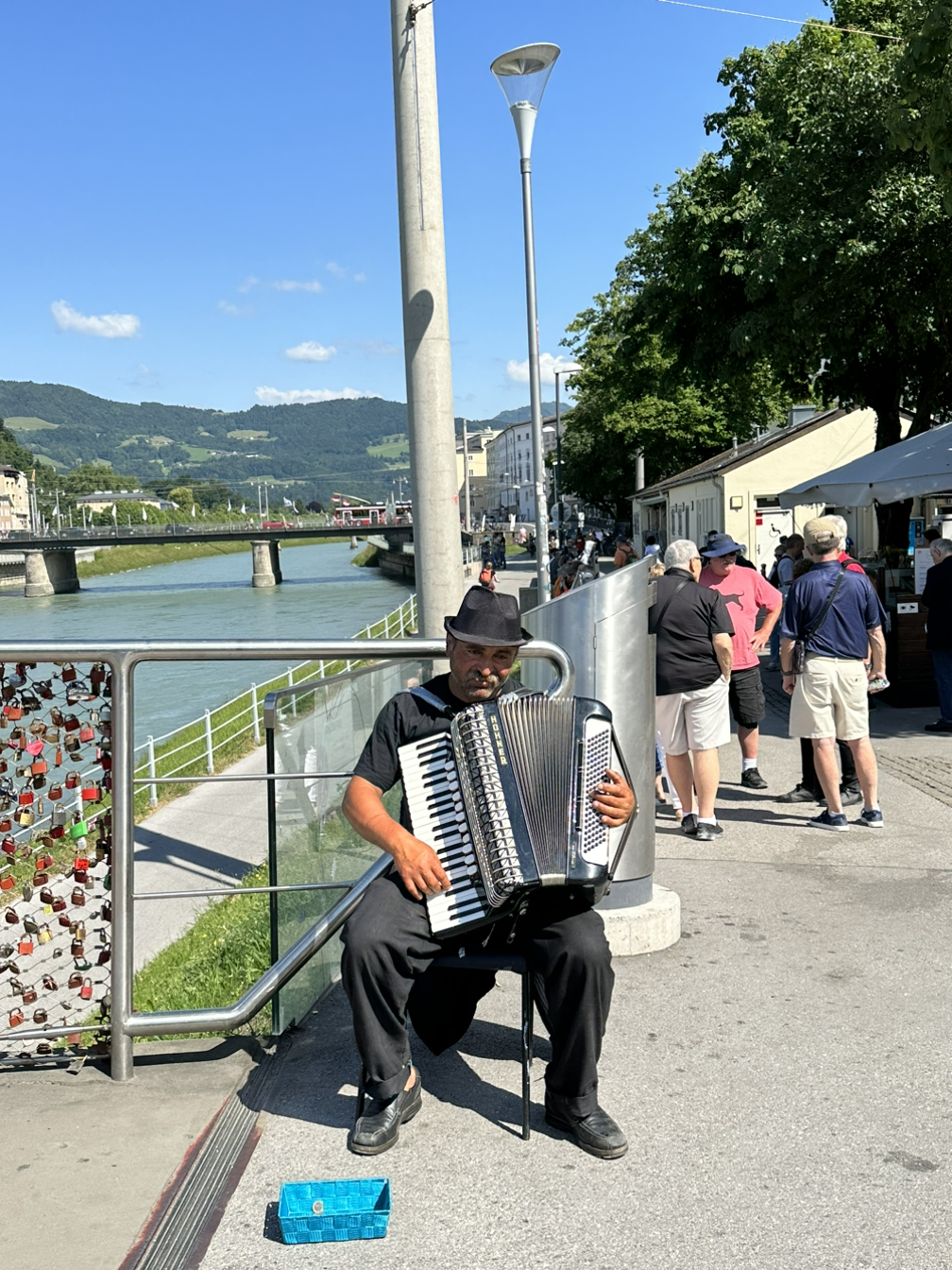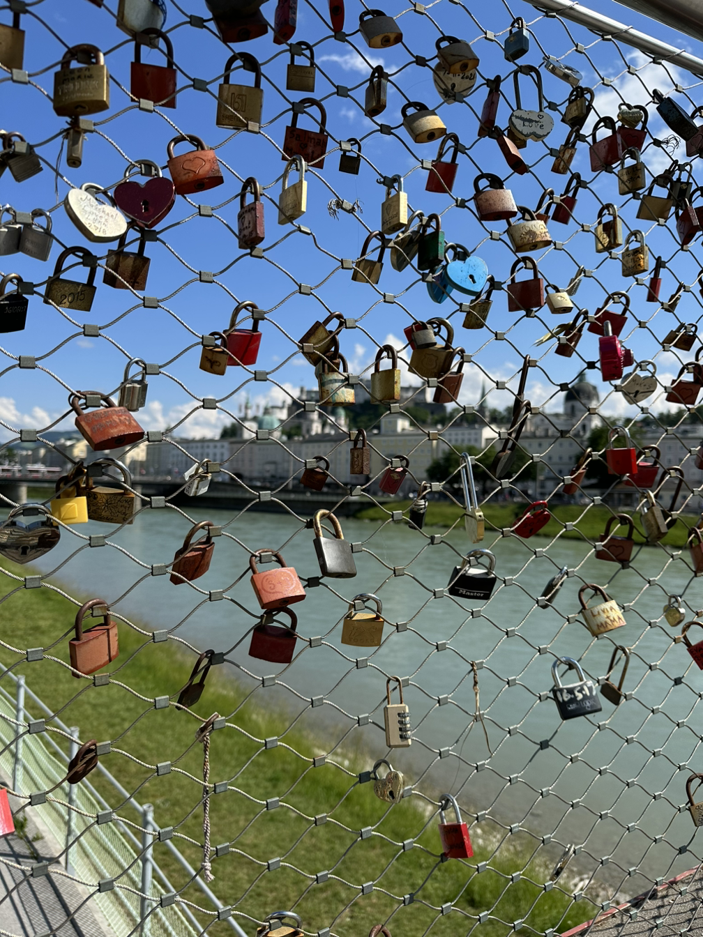 잘츠부르크의 아름다운 다리를 건너 반대편의 명품 골목, 광장들이 있는 곳으로 걸어서 움직였습니다. 잘츠부르크의 다리에도 어김없이 영원한 사랑을 약속하는 열쇠들이 끼워져 있네요. (저도 저런 열쇠를 끼워 볼 날이 올까요...? ㅎㅎ 이런 거 잘 안 믿는 편이라 아마 없을 것 같네요.) 버스킹 하는 음악도 듣고, 다뉴브 강도 바라보고, 더운 날씨도 이겨가며 열심히 걸어 반대편으로 넘어왔습니다.