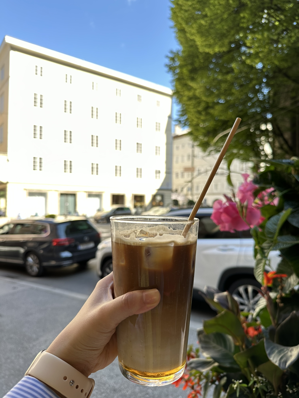 잘츠부르크에서 나름 유명하다고 하는 카페에 아이스커피를 마시러 들어왔어요.ㅎㅎ 정말 저희가 여행하는 날 중 이 날이 가장 뜨겁고 더웠던 것 같아요. 우리는 아이스커피를 시켜서 마시며 잠시 더위를 피했어요. 쉬어가는 타임이니 수다도 떨고요. 유럽에서 느낀 것인데 아이스커피는 우리나라가 가장 맛있는 것 같습니다. 유럽에선 에스프레소와 콘파냐 이런 것들을 충분히 느끼는 것을 추천!