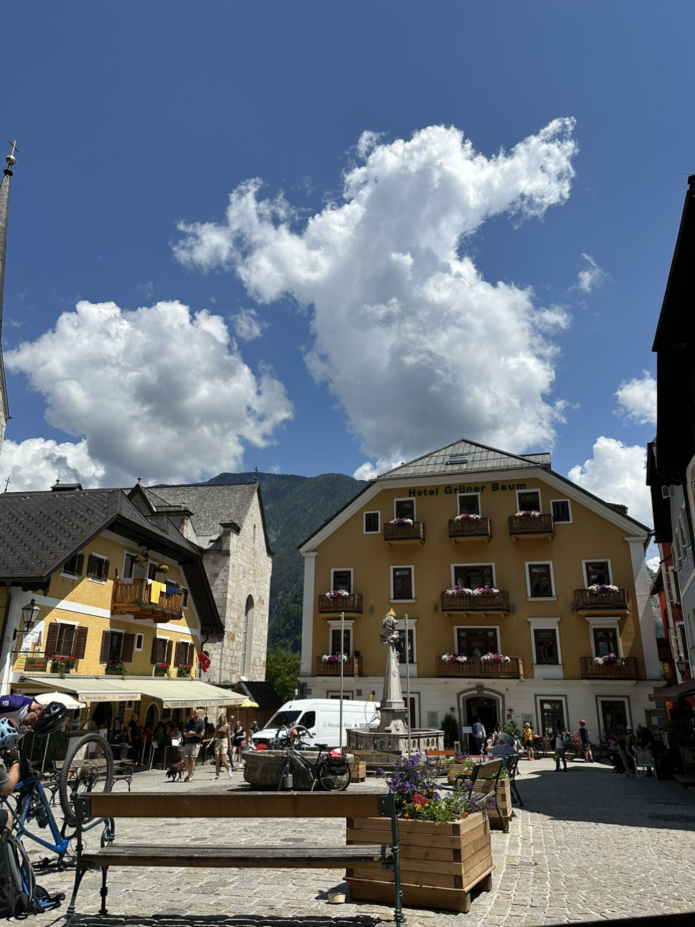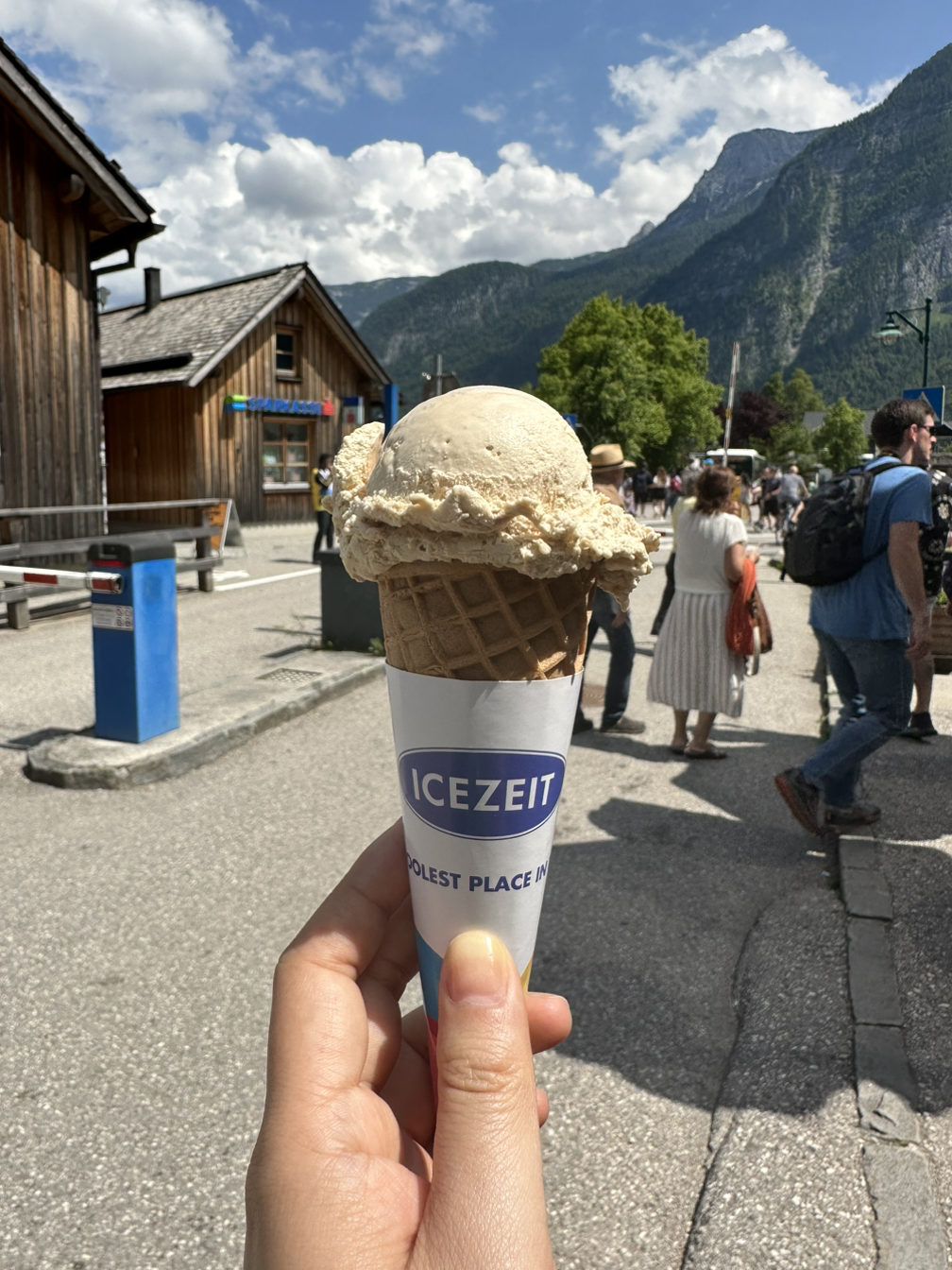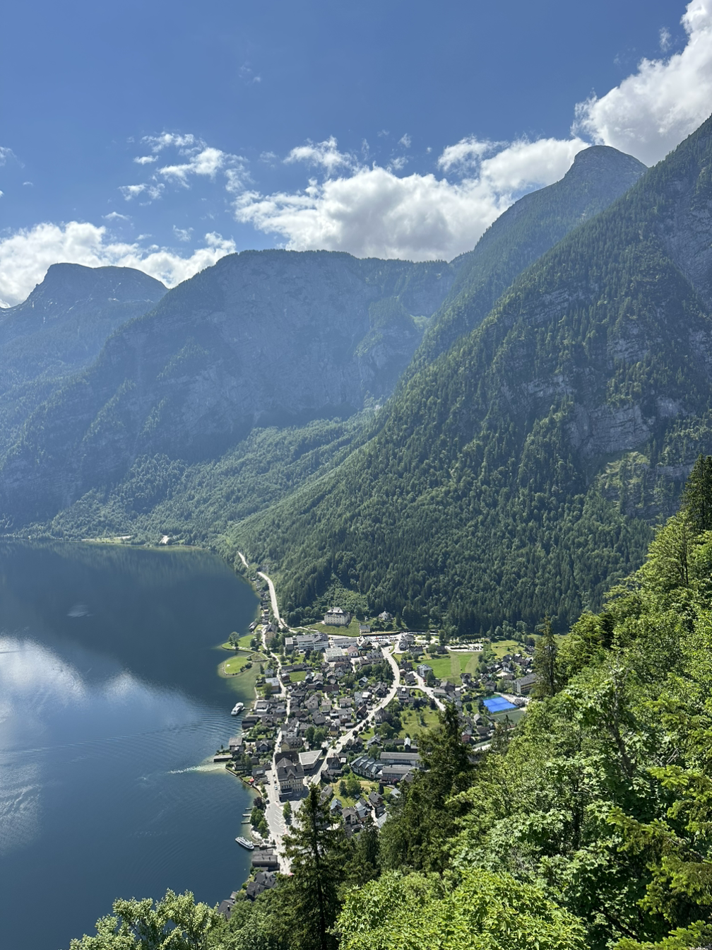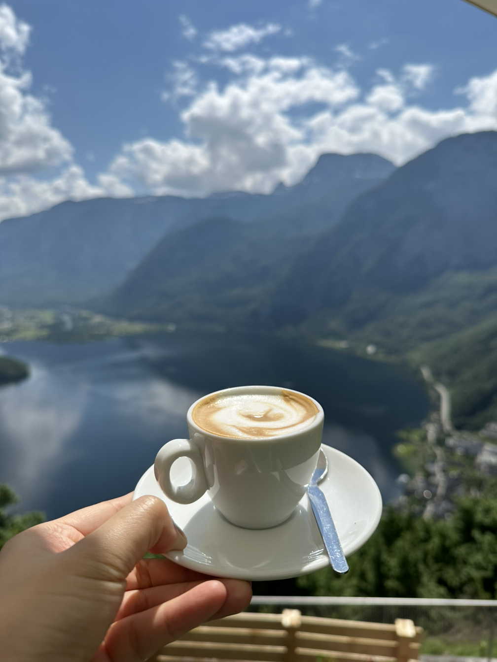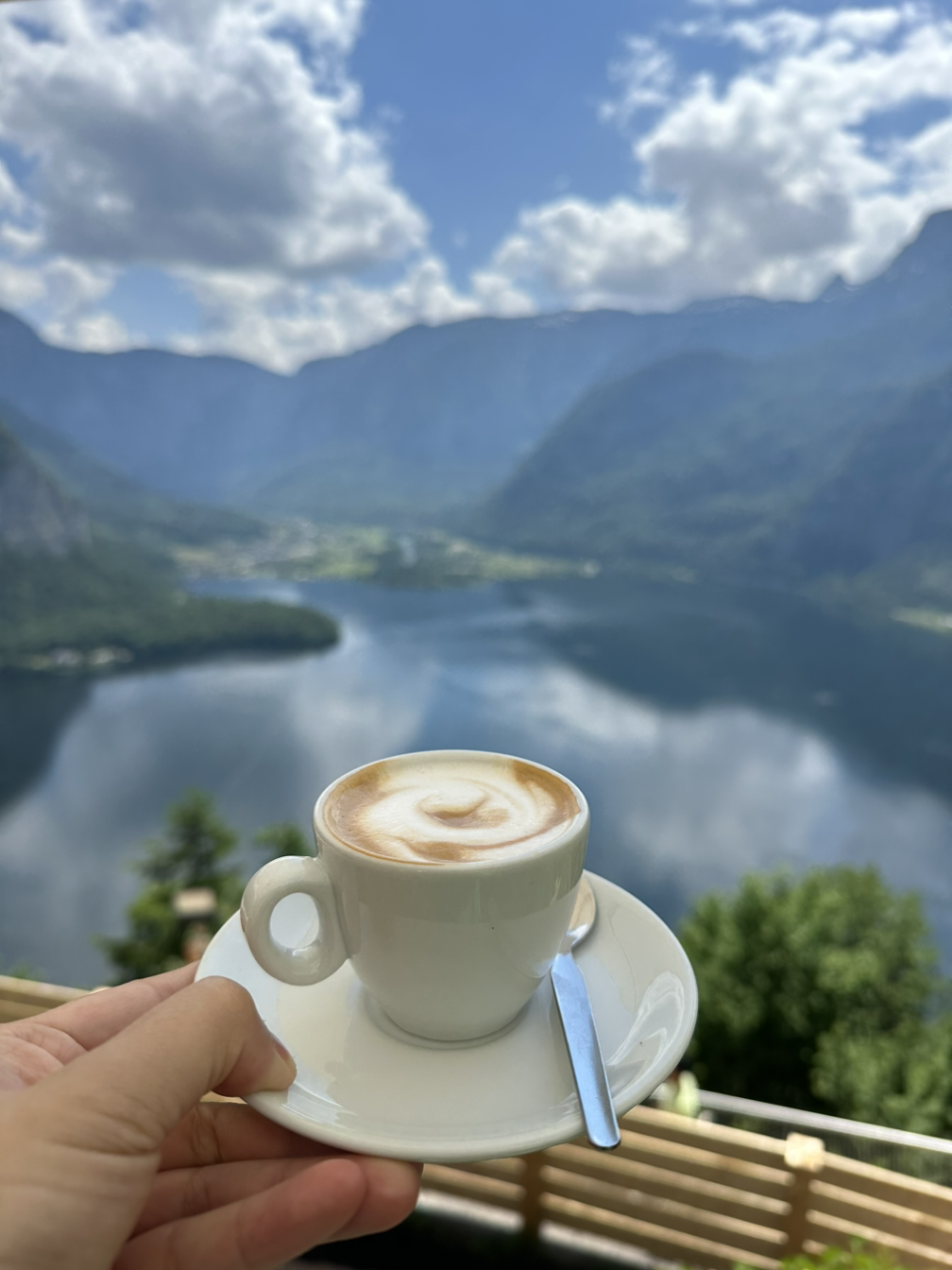 지금사진 작가님께서 스폿에서 천천히 여유 있게 사진을 찍도록 두고, 지노그림 작가님과 저는 정상에 있는 카페에서 에스프레소를 한 잔 마셨습니다. 음식은 맛이 없다는 평을 봤기 때문에 저스트 커피만 마셨죠. 아주 깊은 향이 매력적이었던 에스프레소를 마시며 여유로운 시간을 보냈어요. 그 사이 지금사진 작가님도 오셔서 같이 커피도 마시고 수다도 떨다가 할슈타트를 끼고 있는 동네를 보기 위해 아래로 내려가기로 했죠.