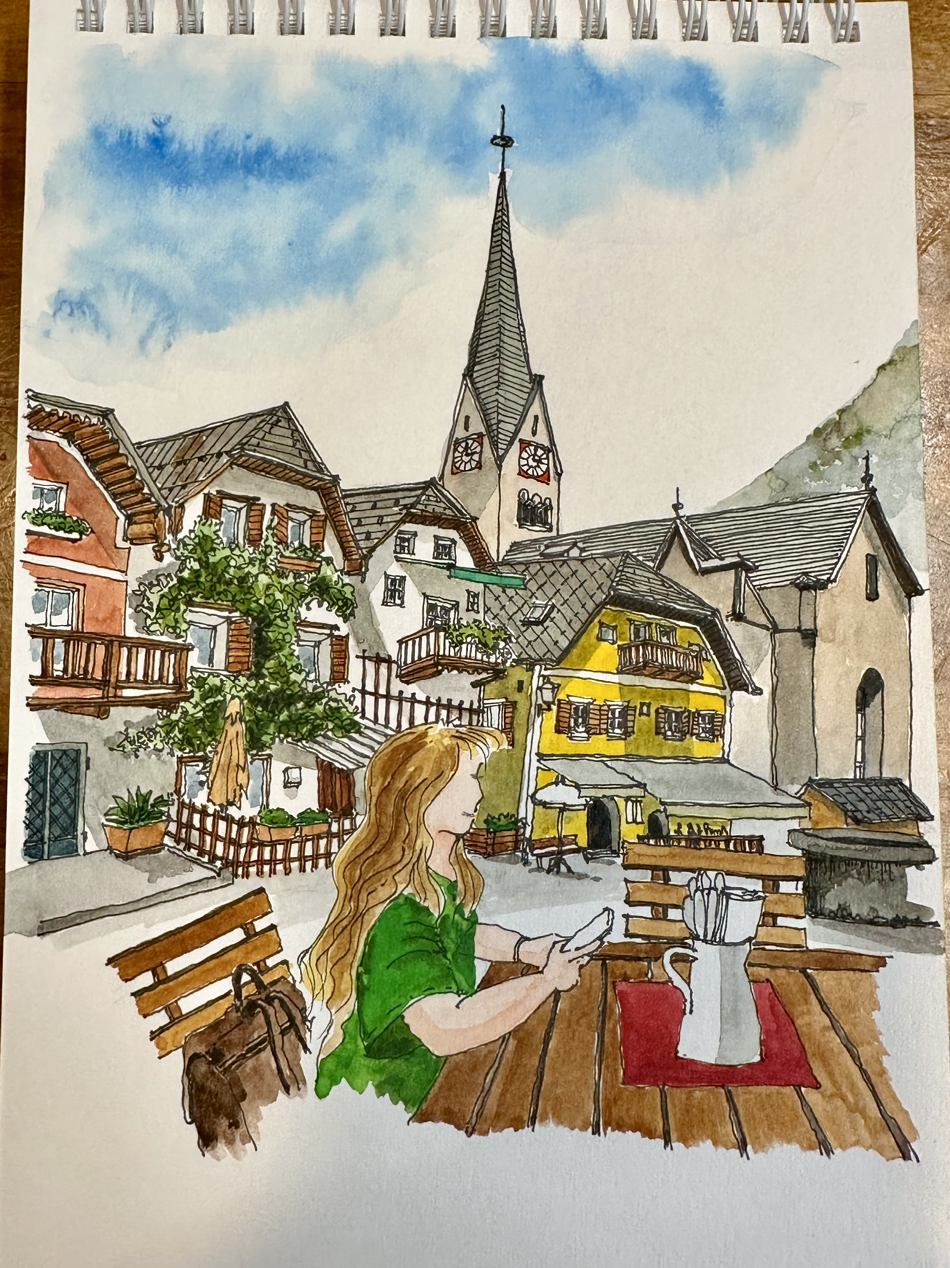 할슈타트에서 점심 먹는 제 모습을 지노그림 작가님께서 이쁘게 그려주셨어요. 이번 여행 중에 생긴 유행어가 또 있는데요. 바로 "사물이 보이는 것보다 예쁠 수 있습니다."입니다. 지노그림 작가님이 그려준 제 모습, 그리고 사진, 영상들이 실제 저 보다 훨씬 예쁘게 나와서 저도 모르게 탄성을 지를 정도였으니까요.ㅎㅎㅎ 이런 기술은 어디서 배우는 건지 궁금합니다.