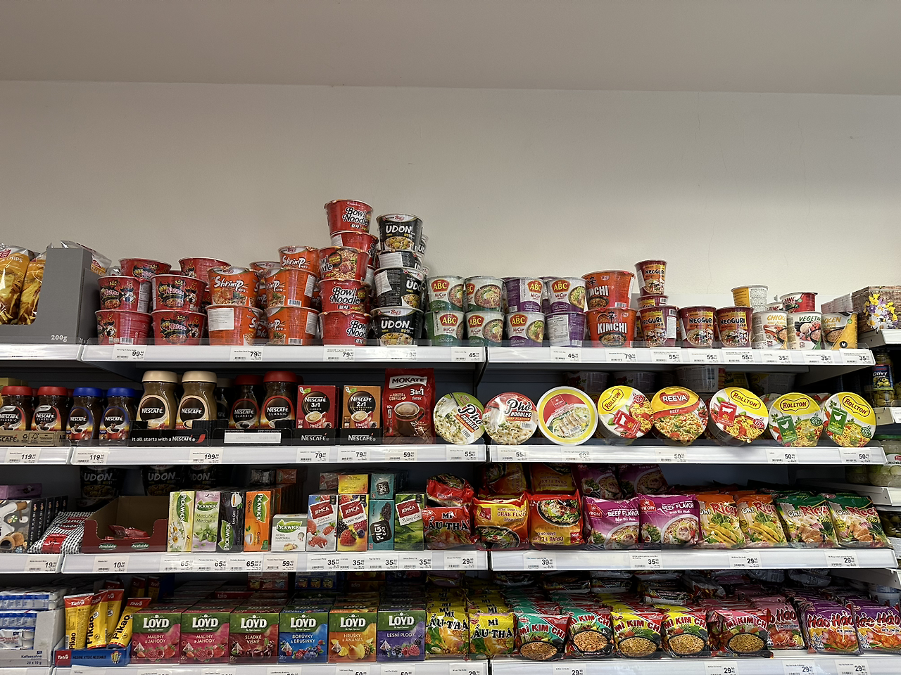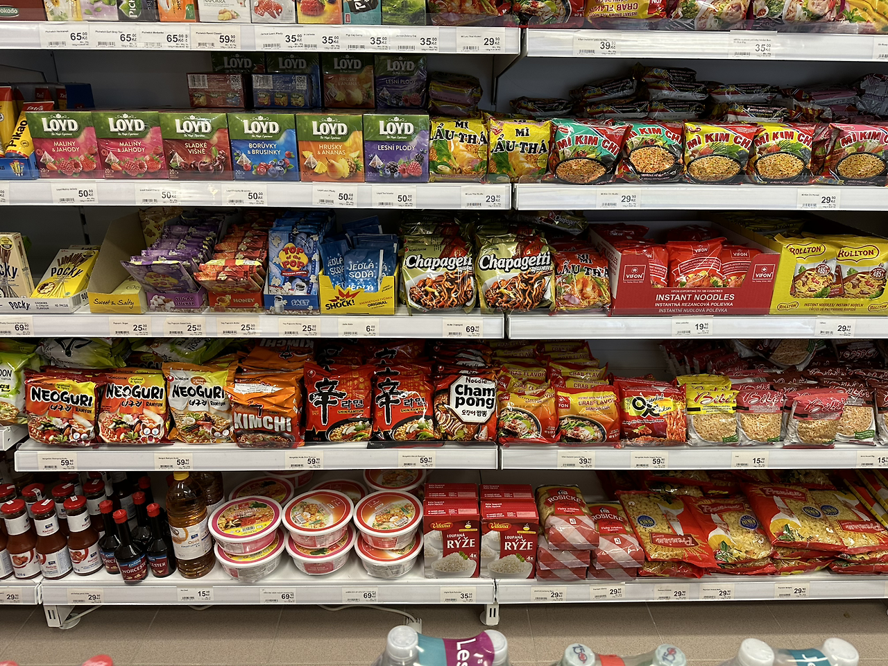 특별한 목적지 없이, 특별히 정한 것 없이 발길이 닿는 대로 골목들을 돌아보기 시작했는데요. 마트만 보이면 일단 들어가고 보는 저희들.ㅎㅎㅎ 신기한 것은 체코의 아주 작은 도시에서도 한국 라면이 아주 인기가 많다는 것이었어요. 실제로 외국인들이 불닭볶음면을 사가지고 가는 것을 몇 번이나 목격했답니다. 저는 매워서 불닭볶음면은 아직 다 못 먹겠더라고요. 이럴 때 애국심이 뿜뿜 한다고 해야 할까요. K푸드가 더 전 세계로 뻗어나가면 좋겠습니다.