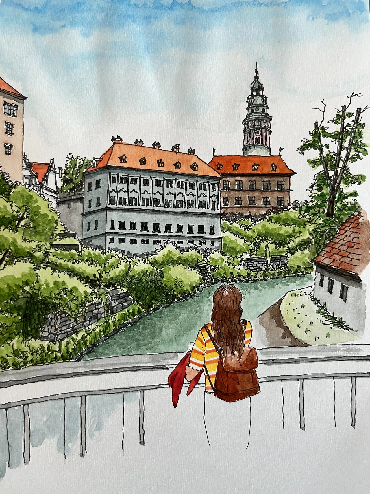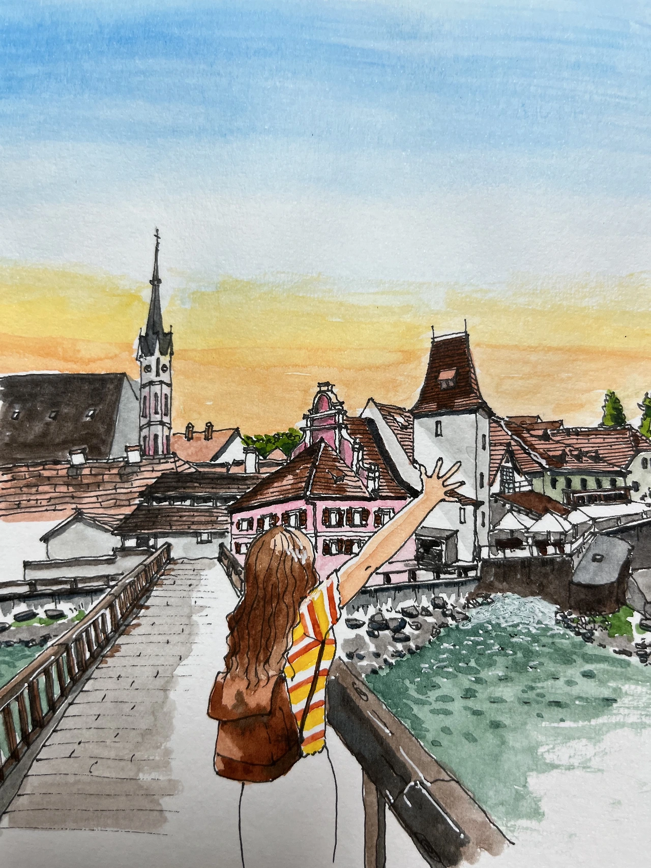 지노그림 작가님께서 신난 저의 뒷모습도 예쁜 그림으로 남겨주셨네요. 노을 지는 햇살의 색과 저의 옷 색이 데칼코마니인 것은 안 비밀. 이제 저희는 내일, 이번 여행의 마지막 도시인 오스트리아 비엔나로 떠납니다. 체코 체스키크룸로프 안녕-
