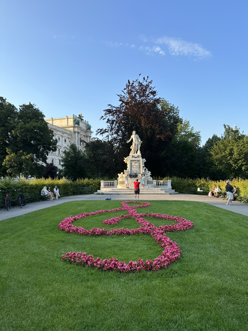 트램에서 내려 처음으로 마주한 잔디 위에는 음악의 도시답게 높은 음자리표가 꽃으로 수놓아져 있었습니다. 저는 저 잔디밭에 앉아서 사진을 열심히 찍었어요.ㅎㅎ 이젠... 시키지 않아도 알아서 포즈를 취하는 수준으로 업그레이드되었습니다.