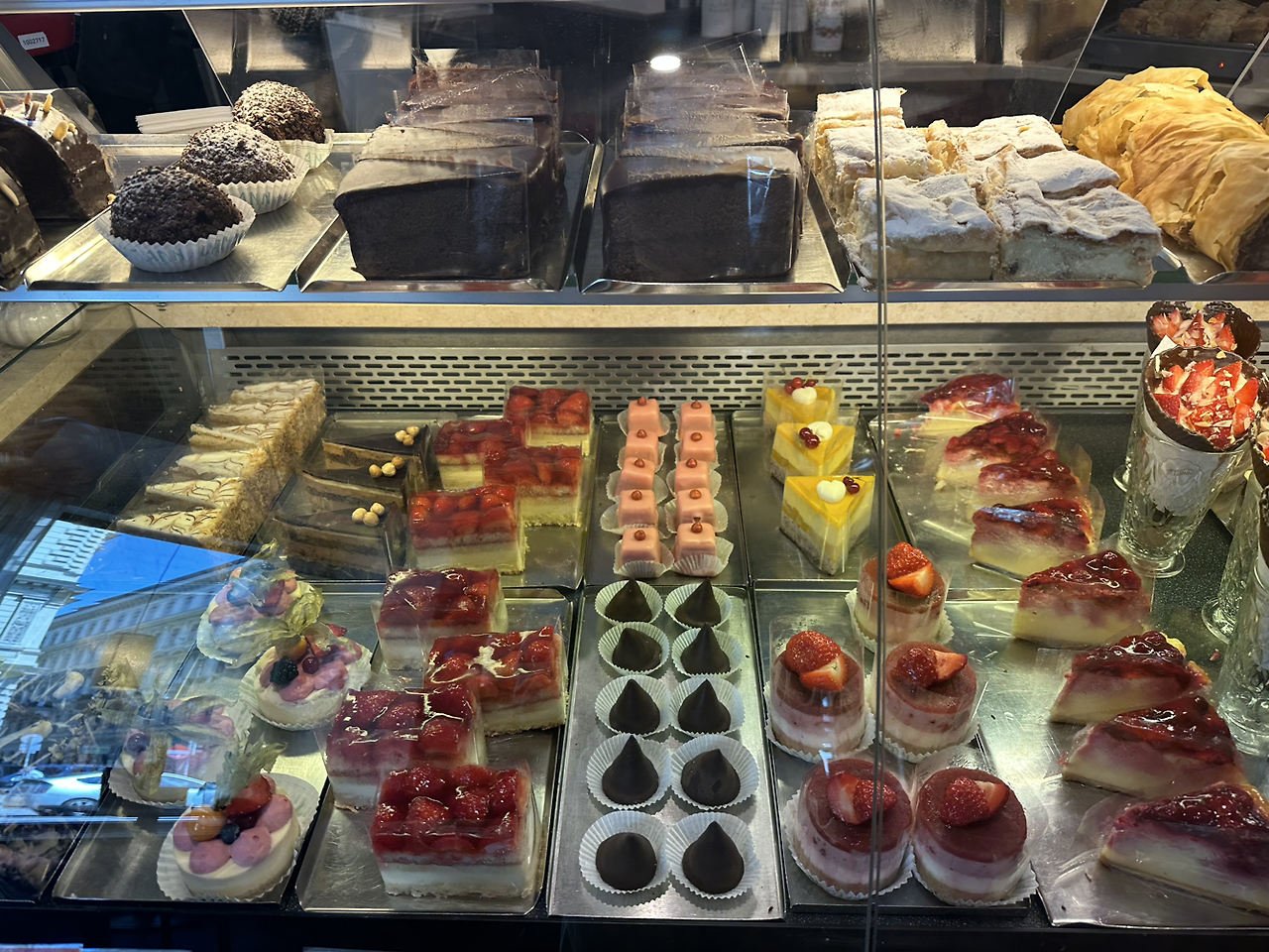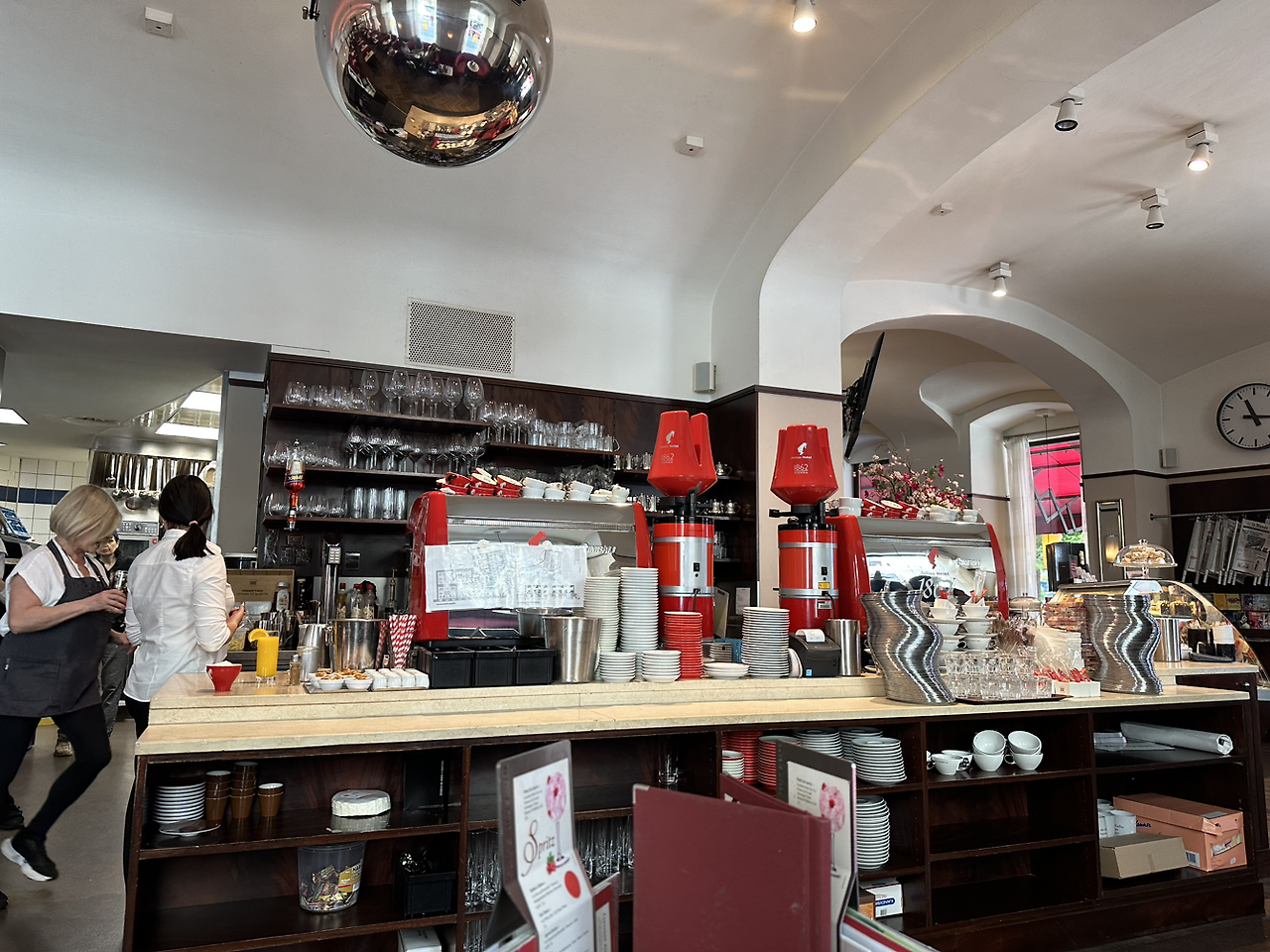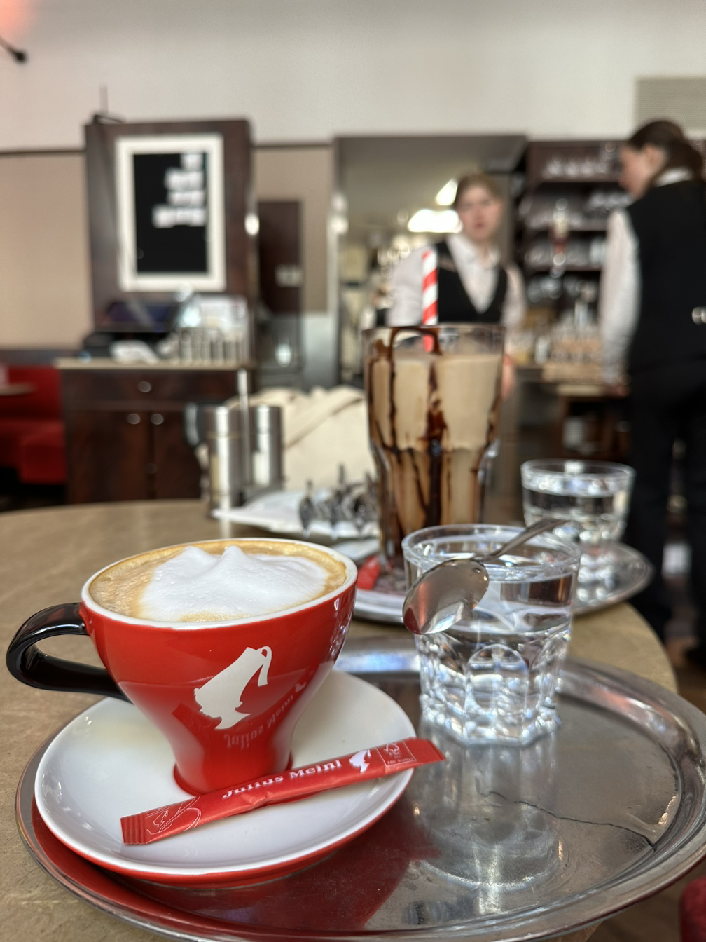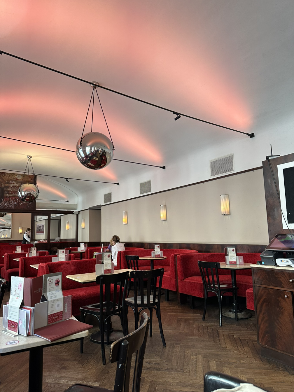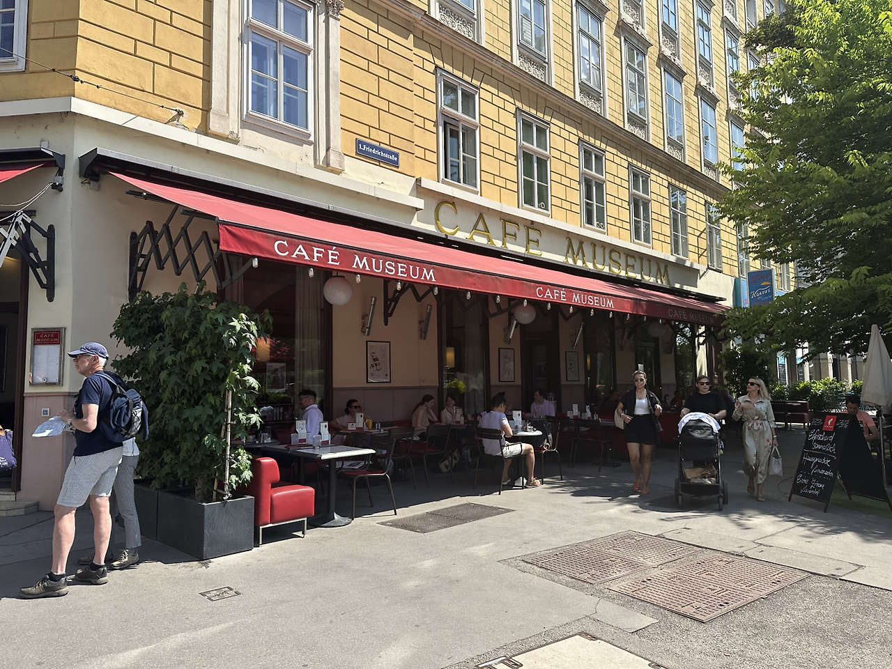호텔에서 느지막이 일어나 체크아웃을 마치고, 프런트에 짐을 맡겼습니다. 공항에 가기까지는 아직 시간이 많이 남았기 때문이에요. 저희는 마지막 남은 시간을 알차게 보내보기로 했어요. 첫 목적지는 어제 가지 못했던 카페 뮤지엄이었습니다. 이곳은 1899년에 생긴 카페인데요. 무려 100년이 넘은 전통이 있는 곳! 아인슈타인과 유명한 화가 클림튼이 실제 자주 방문했던 카페라고 합니다. 빨간 의자가 아주 인상 깊었던 내부 인테리어가 돋보이는 곳이었어요.