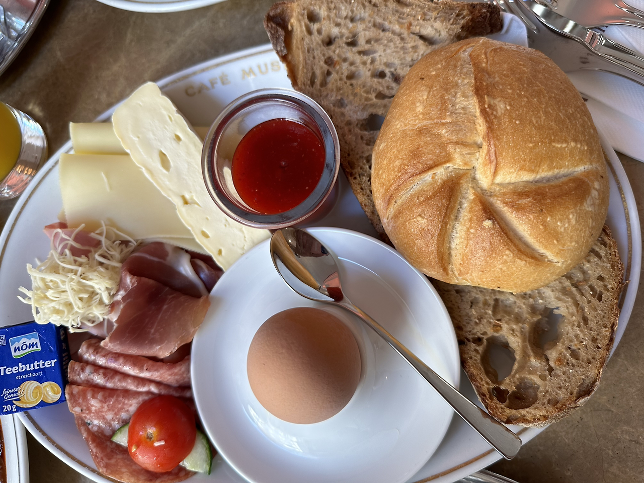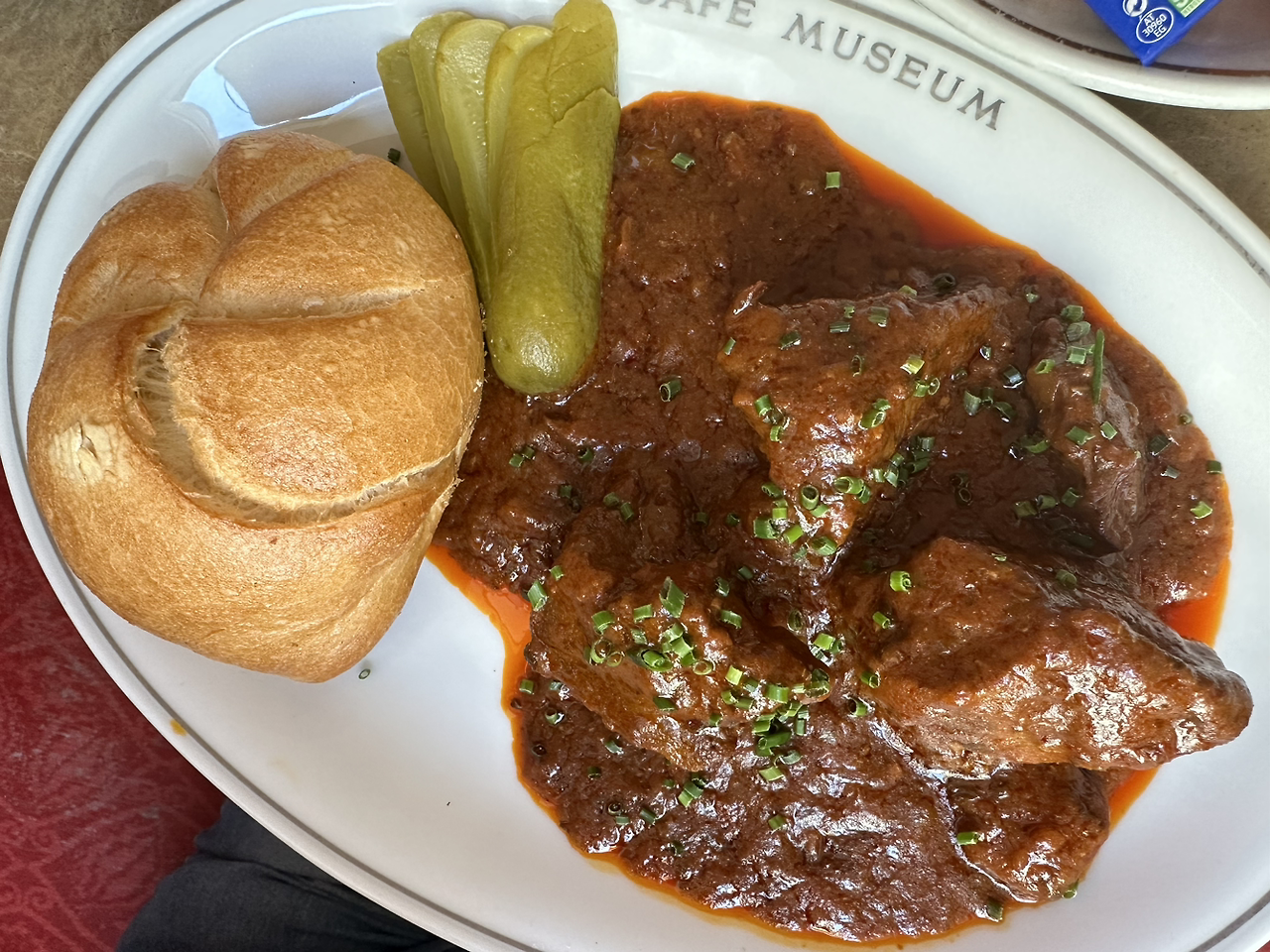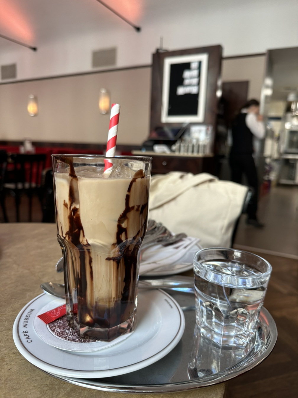 저희는 커피와 함께 이곳에서 브런치를 즐기기로 했습니다. 아마도 해외에서 먹는 마지막 식사가 되지 않을까 생각했었어요. 그래서 팬케이크와 굴라쉬, 브런치세트를 주문했죠. 아이스커피도 함께 주문했습니다. 카페 뮤지엄은 좌석 간격이 넓어서 브런치를 즐기기에 좋았고, 사람들도 많지 않았어요. 예전에는 줄 서야 들어갈 수 있다고 들었는데 최근에는 그렇지 않은 것 같습니다. 마지막 식사를 하면서도 아쉬움이 가득 묻어나 평소보다 사진을 많이 찍었어요.