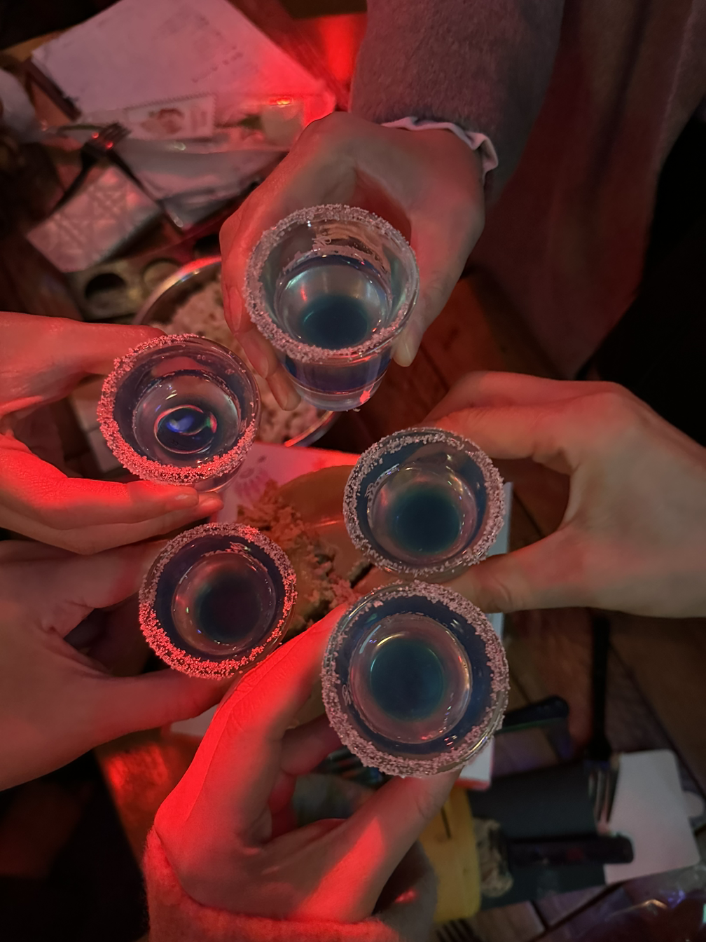 저희는 여기서 유명하다는 칵테일을 시켰는데 그걸 먹기 전에 이렇게 웰컴주를 작은 잔에 주십니다. 많이 독하지 않고, 한 입에 톡 털어 넣으니 맛있었던 웰컴주예요. 여자 다섯 명이 크리스마스에 모이기 쉽지 않은데 어쩌다 보니 이렇게 함께 시간을 보내게 되었습니다. ㅎㅎ