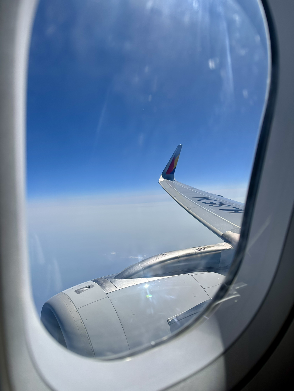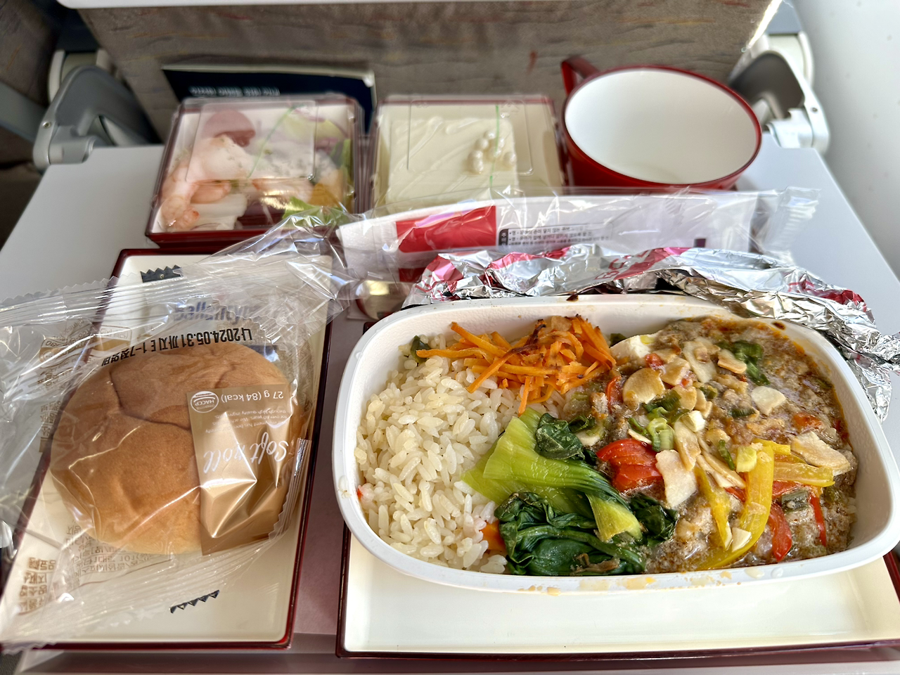 비행기에 탑승했어요. 저는 미리 사전 체크인을 하면서 창가자리로 자리를 선점했습니다. 짧은 비행이라 화장실 갈 일 없고, 방해받지 않고 푹 자고 싶어서 이런 날은 창가를 선호합니다. 운이 좋으면 예쁜 구름과 비행기 날개를 볼 수 있는데 그것도 좋아하고요. 그런데 말입니다.... 푹 자려고 했는데 아까 먹은 아메리카노의 영향인지 잠을 한숨도 못 잤는데, 피곤해 죽을 것 같았는데 잠이 안 왔어요. 그리고 곧 기내식이 나옵니다. 입맛이 없어서 샐러드와 빵, 커피만 가볍게 먹고 눈을 감아보았지만 잠들기 대실패. 뜬 눈으로 2시간 20분을 날아 연길에 도착했습니다.