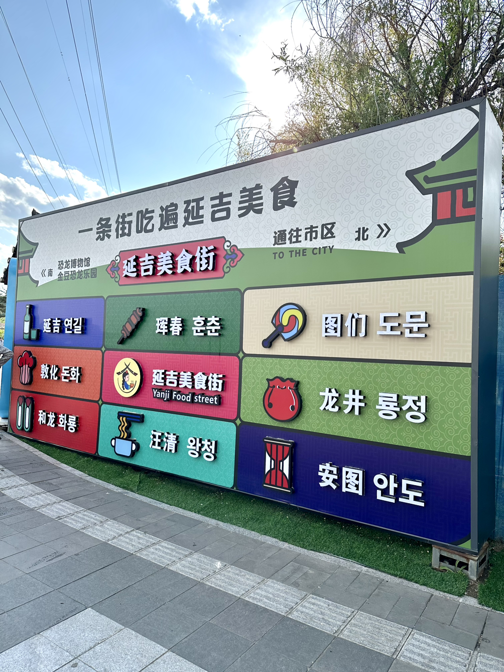 민속촌 앞에 간판입니다. 연변 조선족 자치주는 원래 모든 간판에 한글표기를 원칙으로 하고 있습니다. 그래서 한글표기 먼저, 그다음 중국어 표기를 하도록 되어있었는데요. 최근에 법이 바뀌어 중국어 표기 먼저, 그 뒤에 한국표기로 바뀌었다고 해요. 조선족 학교에서도 이전에는 한글과 한국말로 수업을 했었는데, 현재는 중국어로 수업하도록 법이 바뀌어서 한글은 영어처럼 수업시간 안에 잠깐만 배운다고 하네요. 이런 점이 우리나라의 역사를 감추거나, 없애려고 하는 것 같아서 이번 연길에서는 많이 속상했습니다. (모두 중국으로 편입하려는 거야...?ㅠㅠ 의도를 알아서 더 속상한 1인)