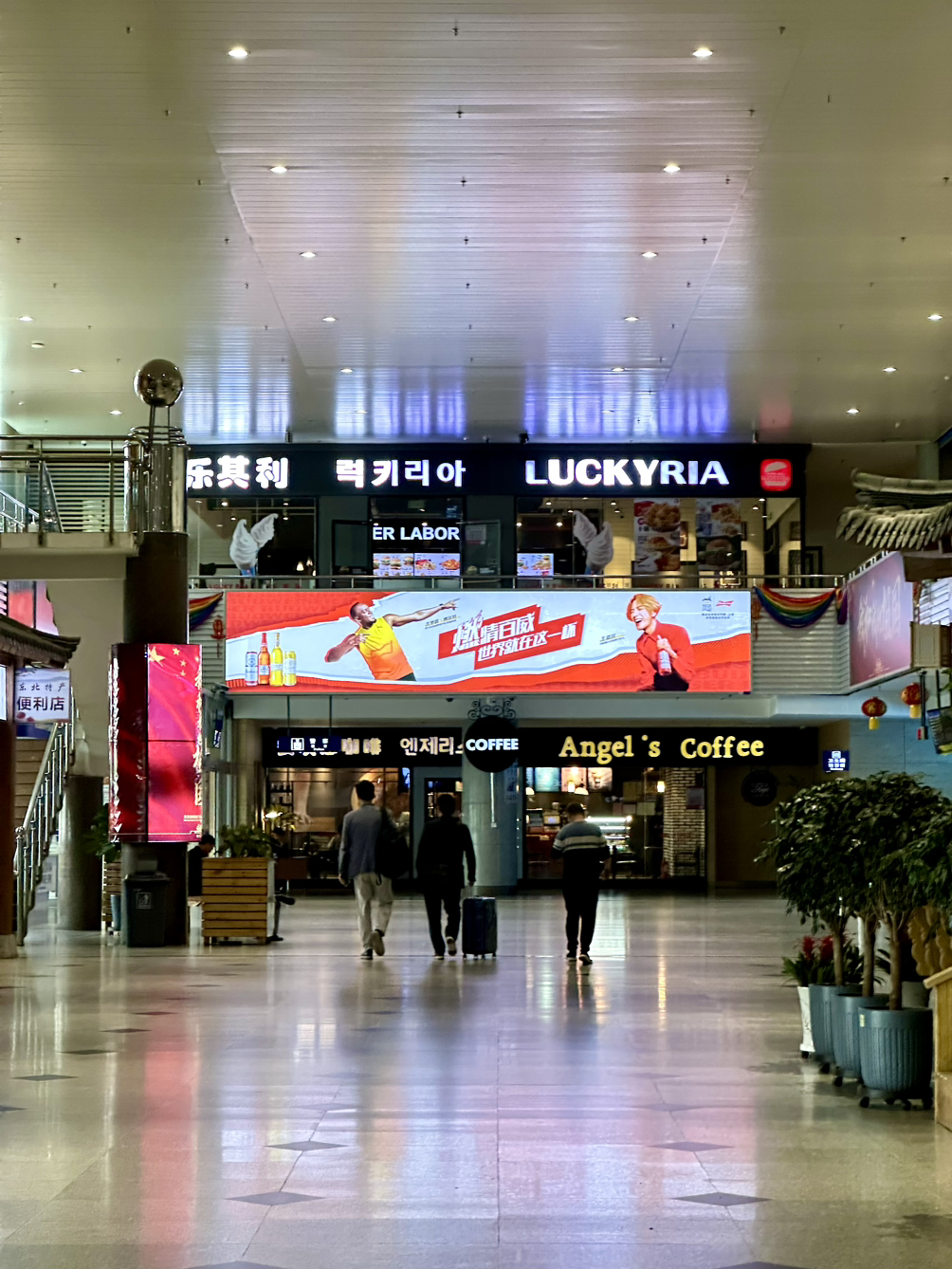 공항 내부에 있는 럭키리아. 우리나라의 롯데리아와 비슷하죠?ㅎㅎ 많은 분들이 찍길래 저도 살짝 찍어보았습니다. 카페도 있고요. 이제 연길은 거의 한국의 문화와 비슷해진 것 같아요. 수속하는 줄이 길어서 얼른 줄을 섰습니다. 차라리 공항 안에 들어가서 쉬는 게 나을 것 같더라고요.