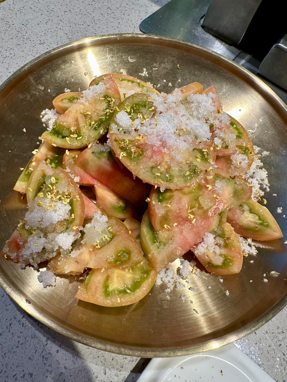 설탕 뿌린 토마토는 서비스로 주셨는데 누구나 아는 맛이지만 언제 먹어도 맛있습니다. 상추가 너무 커서 한 번 찍어봤어요. 정말 제 얼굴만 해서 너무 놀랐던 상추 크기.ㅎㅎㅎ