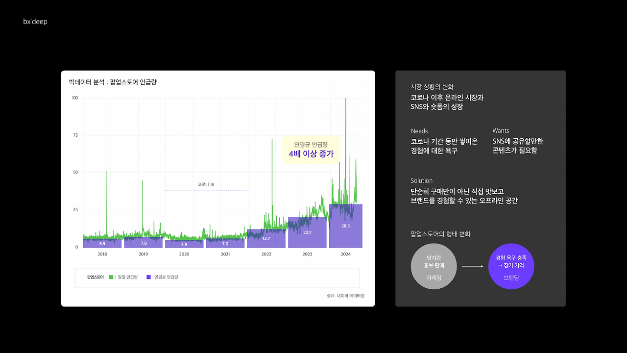 아래 이미지에서 보실 수 있 듯, 네이버 데이터랩을 통해 2018년 대비 연평균 팝업스토어의 언급량이 4배 이상 증가했음을 알 수 있었습니다. 즉, 저를 포함한 많은 사람들이 팝업스토어에 관심을 가지고 있다는 것을 알 수 있습니다.