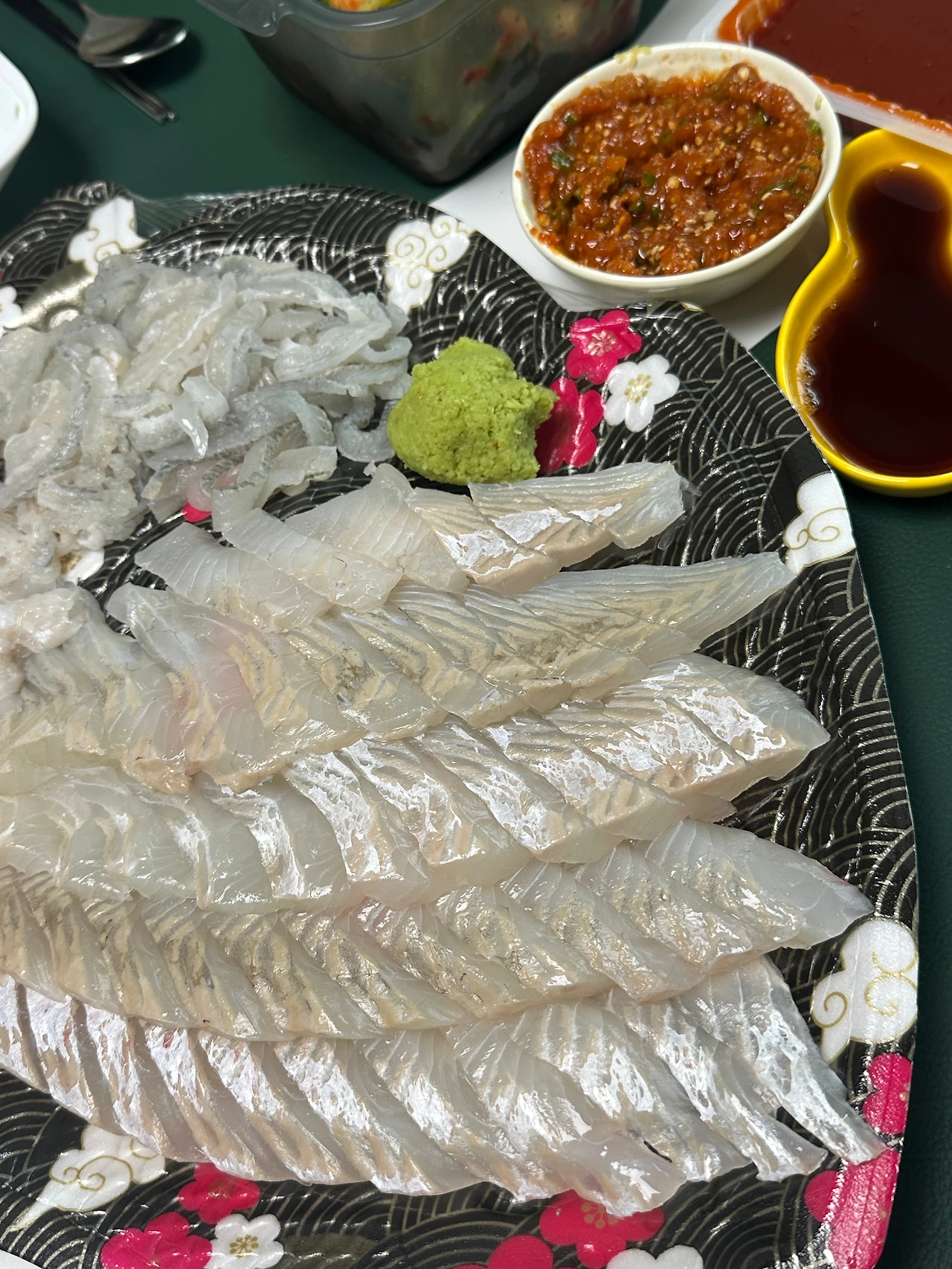 간장, 고추냉이, 쌈장이 준비되었고, 그 옆에는 도톰하고 탄탄한 도다리회, 얇고 투명하게 썰린 세꼬시가 나란히 놓였다.