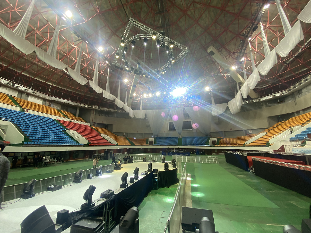 체육관을 세로로 두고 무대가 서있었고 1층은 스탠딩, 2,3층은 좌석 형태의 공연이었다.