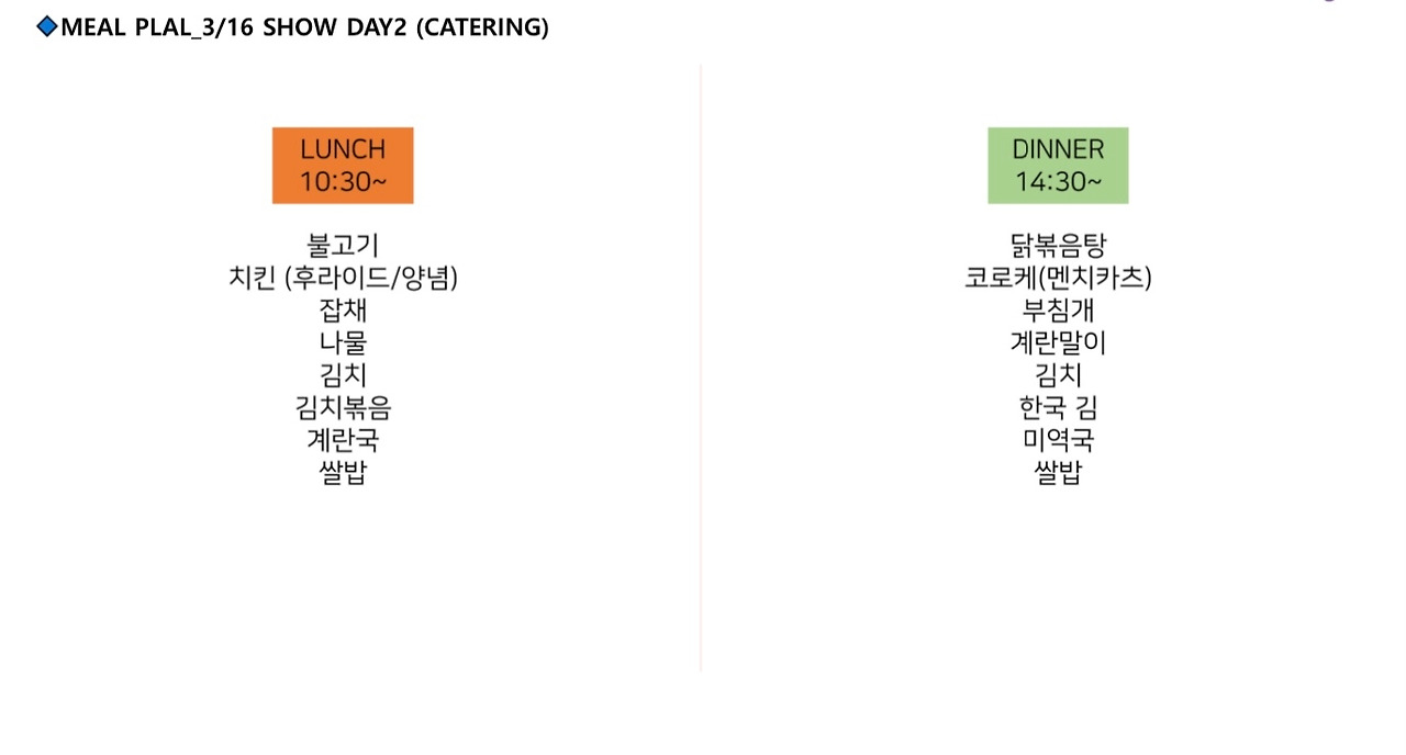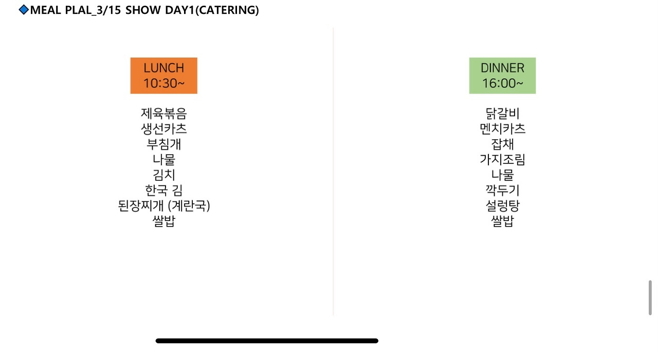공연 당일 이틀은 전부 한식 케이터링으로 준비해 주셨다.