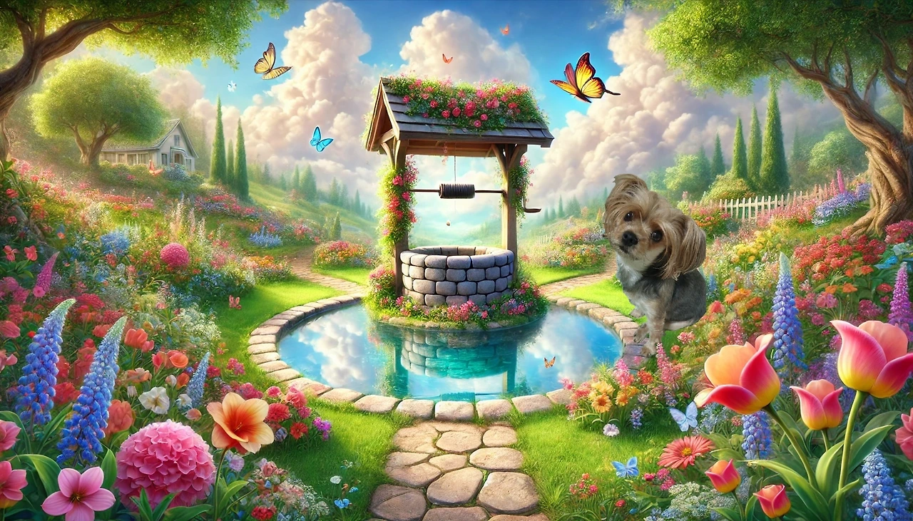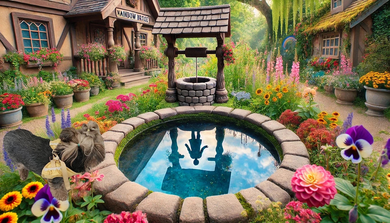 무지개다리 환영의 집 정원 한가운데에는 아주 특별한 우물이 있어. 그 우물 가장자리를 따라 작은 꽃들이 가득 피어있고 물은 맑고 투명해서 들여다보면 마치 거울처럼 보여. 이 우물은 지구에 있는 우리가 사랑하는 사람들의 모습을 보여주는 마법 같은 힘을 가지고 있어.