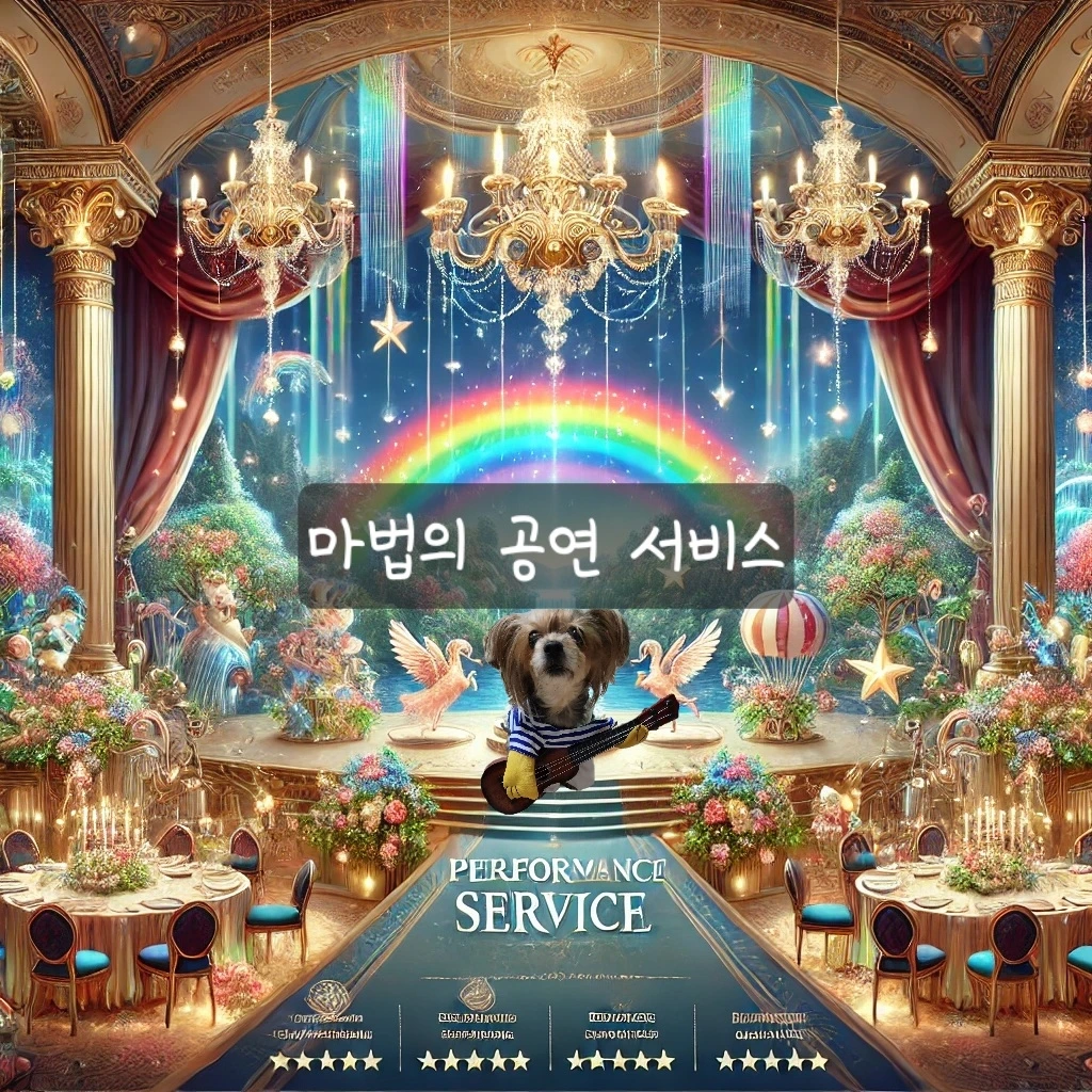 마법의 공연 서비스 (Magical Performance Service) 마법의 공연 서비스는 무지개나라의 예술가들이 마법을 사용해 멋진 공연을 선보이는 서비스야. 축제나 특별한 행사 때 공연을 요청할 수 있어.
