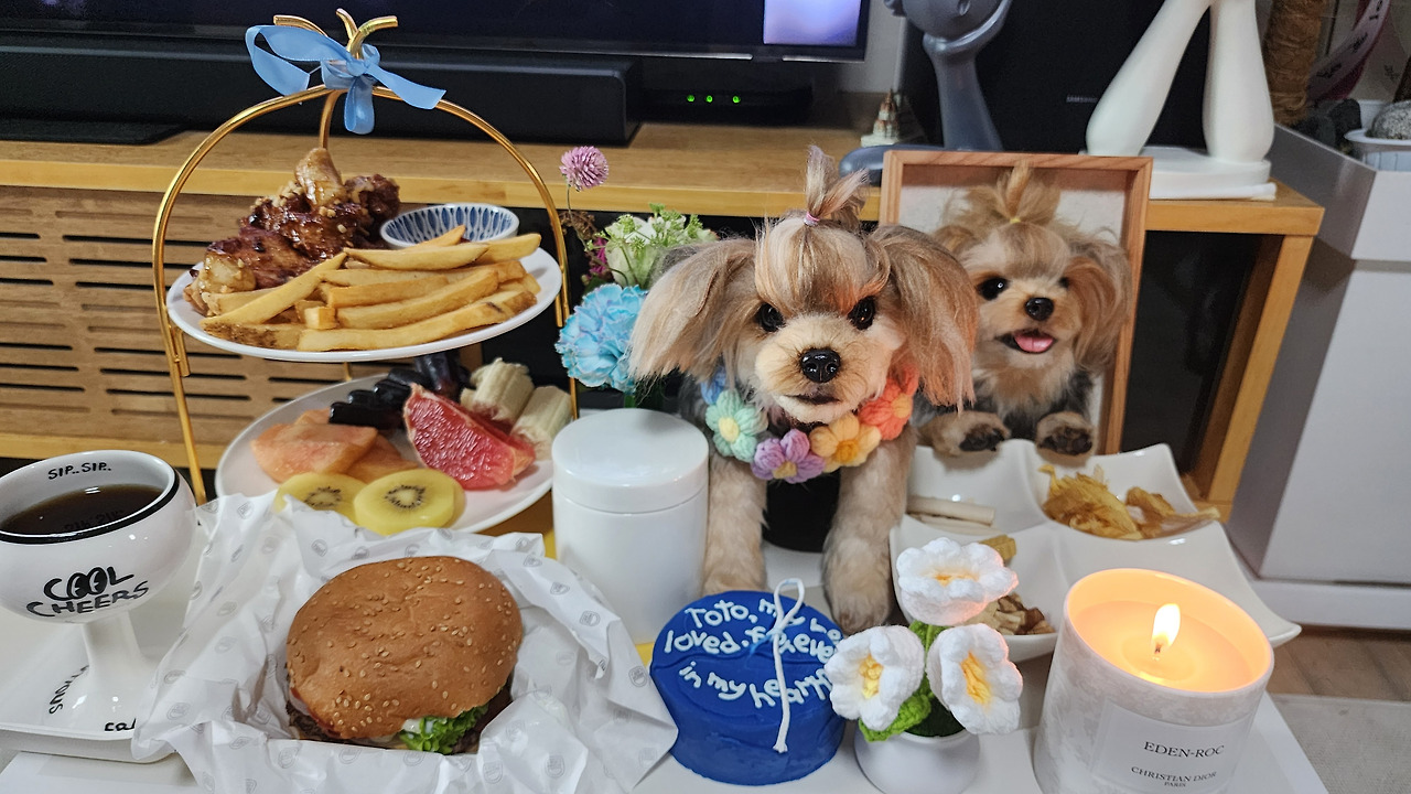 언니, 오늘이 내가 떠난 지 49일 되는 날이잖아? 언니가 집에 엄청 맛있는 거 잔뜩 준비해놨더라! 감자튀김, 햄버거, 닭강정, 복숭아, 바나나, 자몽... 내가 좋아했던 쌀껌이랑 치카치카 껌까지! 대박! 도착하자마자 싹 다 먹어버렸어! 친구들도 불러서 같이 나눠 먹었지. 다들 우리 언니가 준비한 음식에 감탄했어. 흐흐, 김토토 으쓱했지!