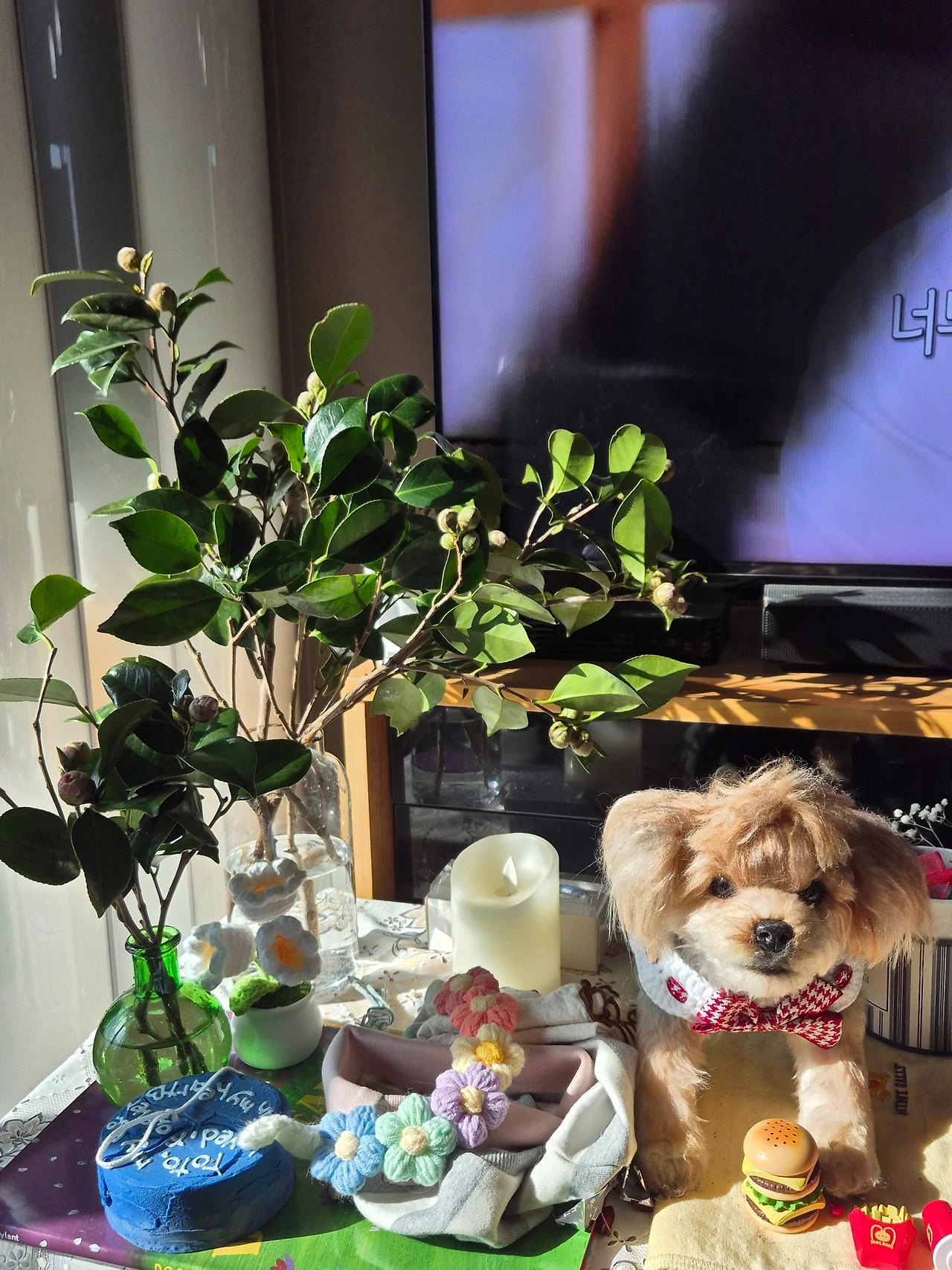 마음이 무거울 땐 꽃을 산다. 요즘 마음이 무거운 일이 많아서인지 매주 새 꽃을 들이고 있다. 이번 주의 선택은 동백. 내가 좋아하는 꽃 중 하나이다. 제일 먼저 토토 아트돌 옆에 살포시 자리를 잡아줬다.