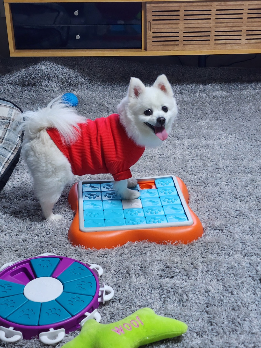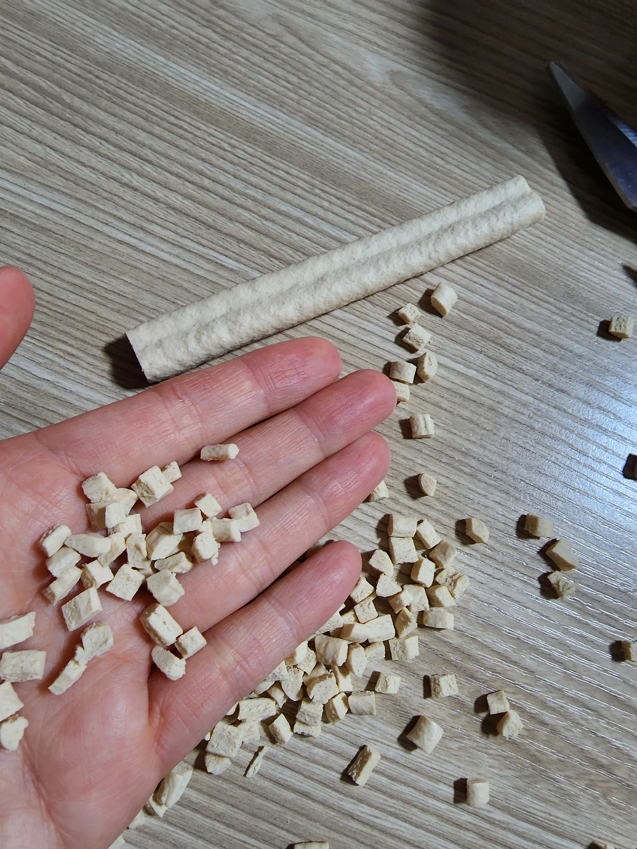 그리고 쌀 껌을 급여하는데 이것 또한 예전 같으면 하나씩 턱턱 던져 줬겠지만 지금은 그럴 수 없으니 하나를 가위로 아주 잘게 쪼개서 노즈 워크용으로 쓴다. 그러면 천천히 먹고, 냄새도 맡으며 스트레스도 풀 수 있으니까 일석이조다.