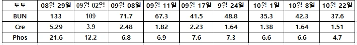 크레아티닌과 인 수치는 이제 정상이고 BUN만 좀 신경 쓰면 된다. 혈액 검사를 자주 하고 싶어도 토토는 빈혈이라 조혈 주사를 맞고 있는 판에 자꾸 피 뽑을 순 없어서이제 일주일에 1회 정맥 수액 맞으며 2주에 한번 혈액 검사로 추이를 확인해보는 것이 좋겠다는 것이 수의사의 의견이다.