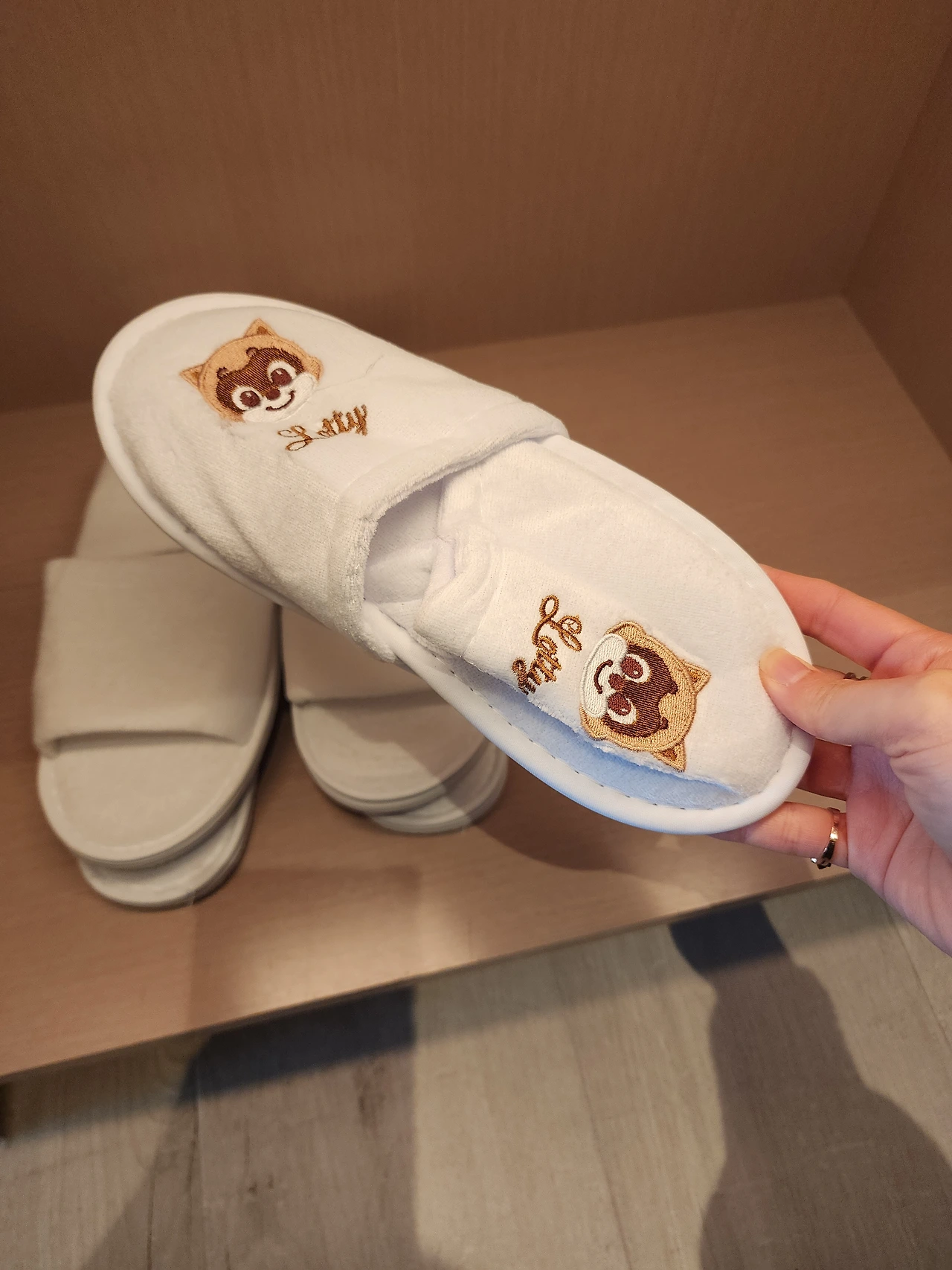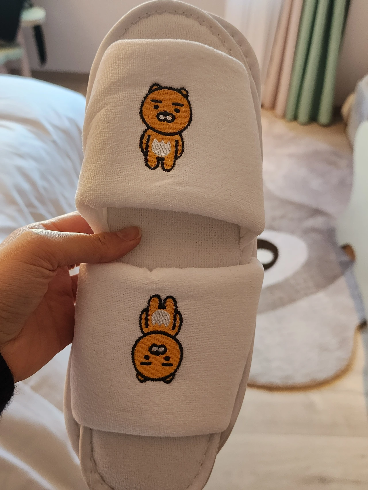어린이용 슬리퍼와 가운을 걸칠 수 없으니 성인용으로 한 세트 가져와달라고 부탁했는데 뜻밖에 라이언 슬리퍼 겟!