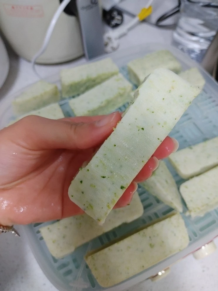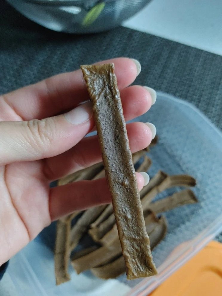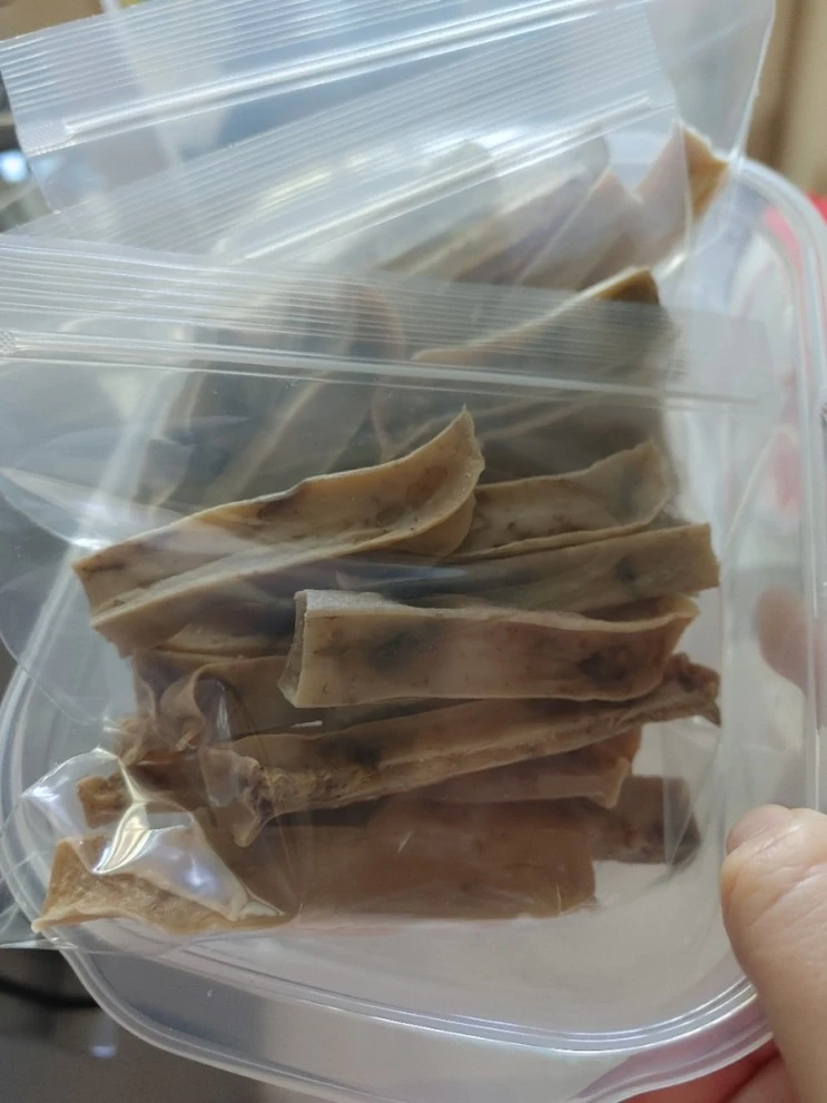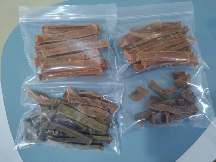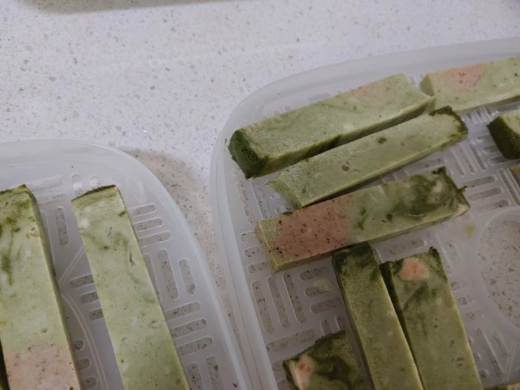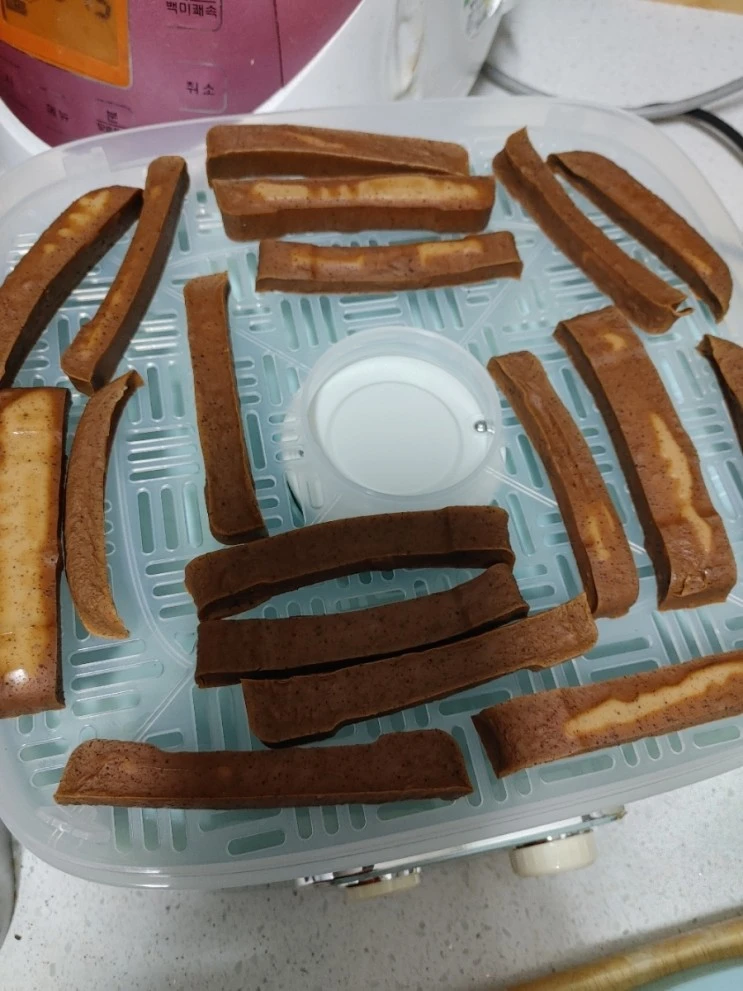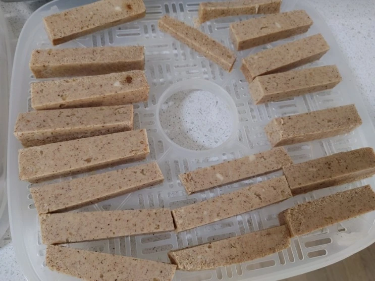 *냉동실에 넣으면 어차피 더 단단해진다. 적당히 마르면 그만두는 것도 괜찮다. 나는 노견 두 마리가 있어 아주 딱딱한 정도까지는 말리지 않는다.